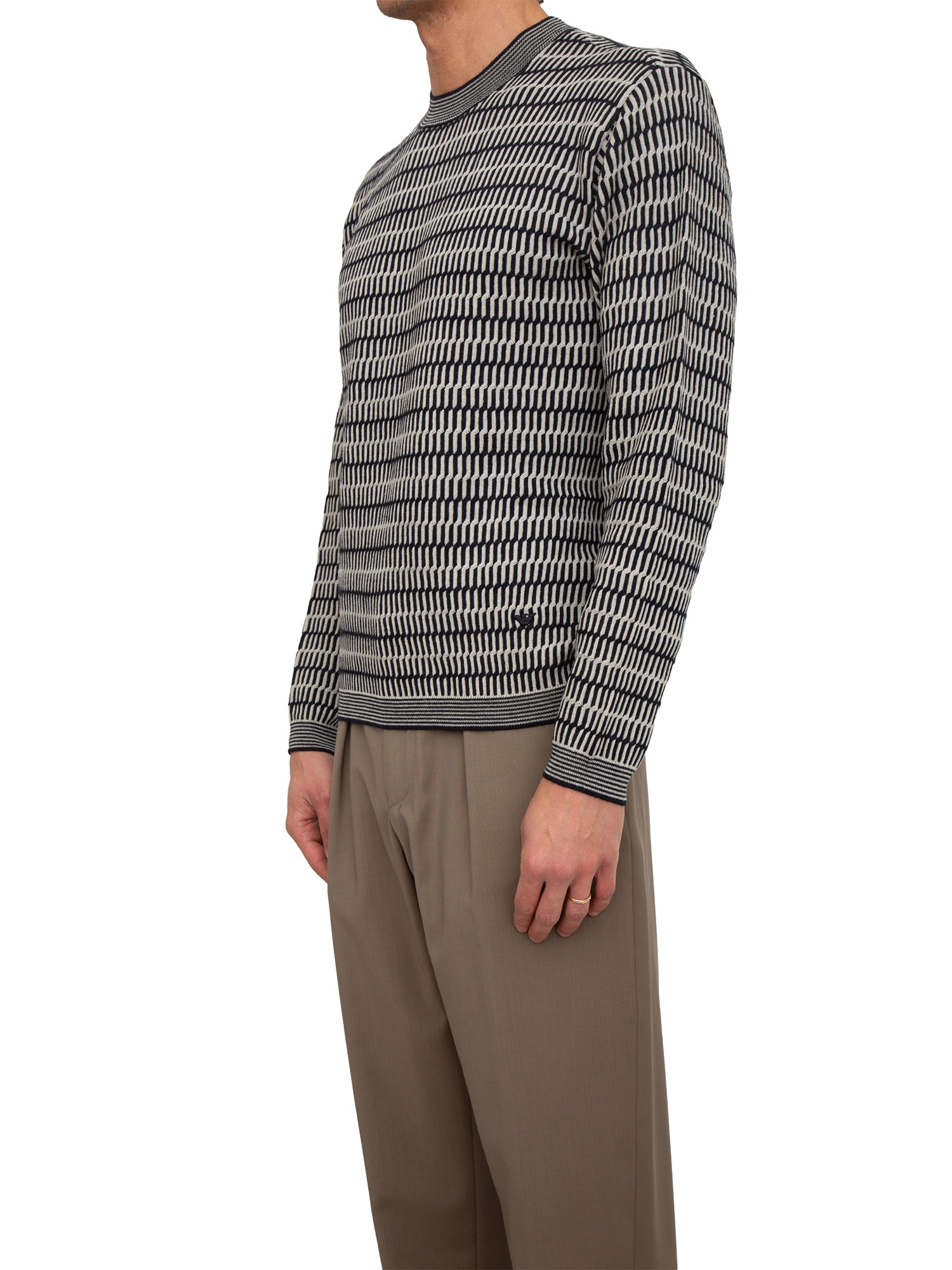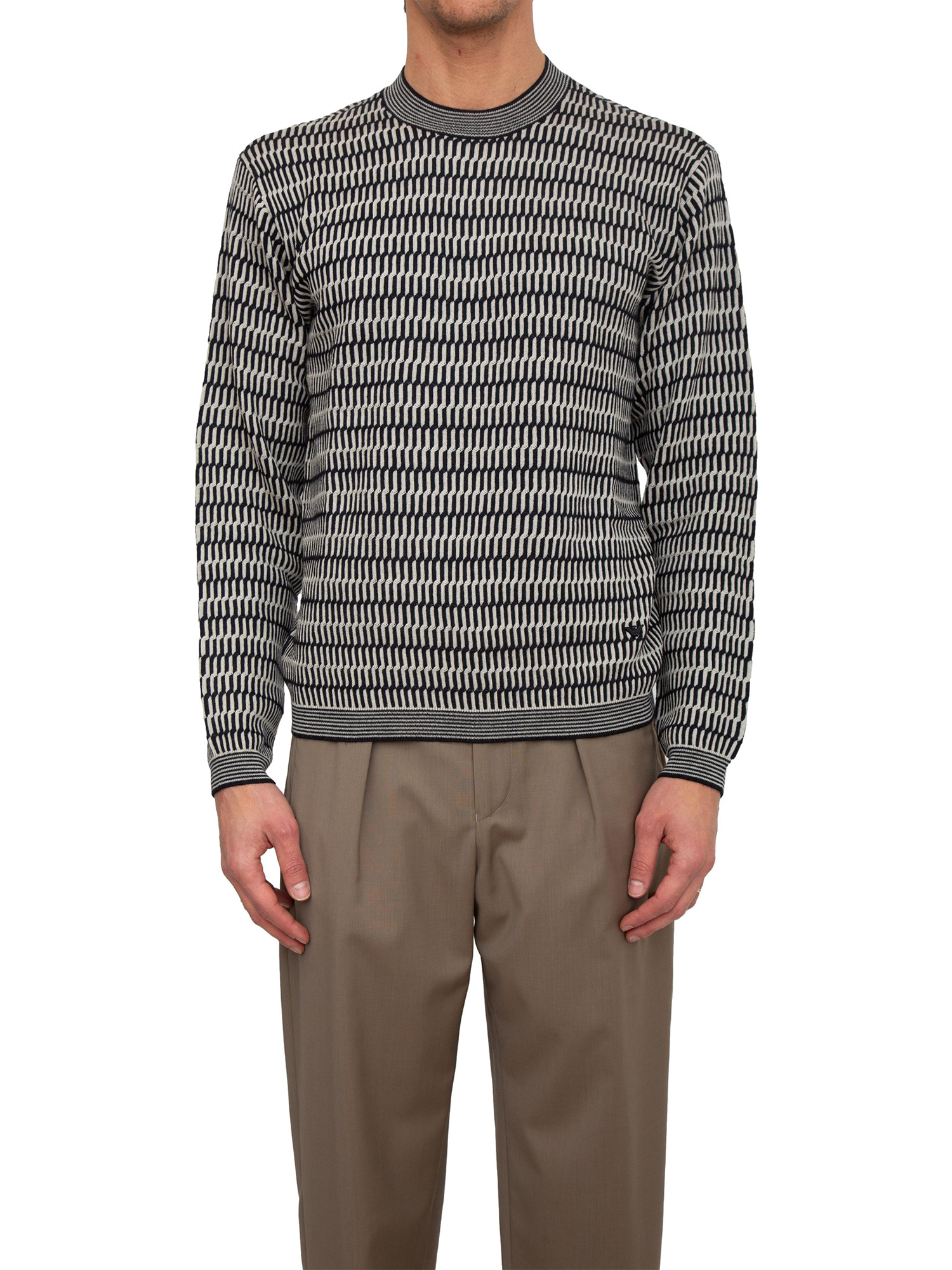 Brand: EMPORIO ARMANIMaglia uomo a girocollo Emporio Armani realizzata in pura lana vergine. La lavorazione jacquard a punto spugna rende la texture particolarmente morbida e crea un fitto motivo bicolore all over. Il modello è alto 1.90m e indossa la taglia L.