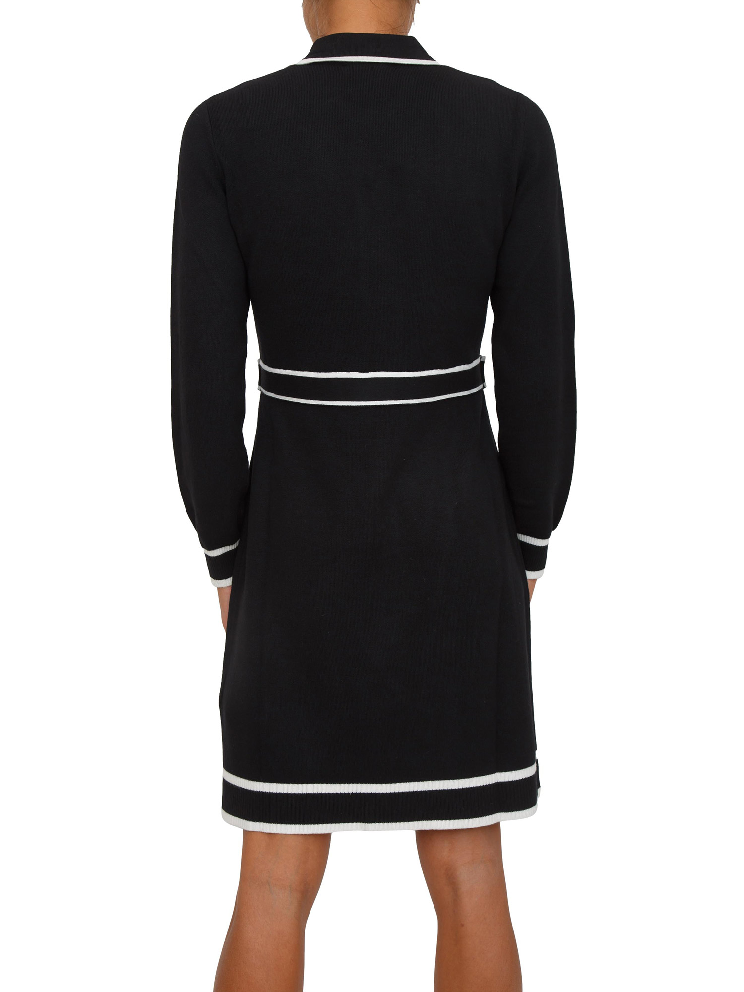 Abito Liu Jo realizzato in maglia di misto seta con motivo righe a contrasto e bottoni decorativi. Colletto polo con zip, maniche lunghe ed inserti con logo jacquard sulla vita. La modella è alta 1.72 e indossa la taglia XS.