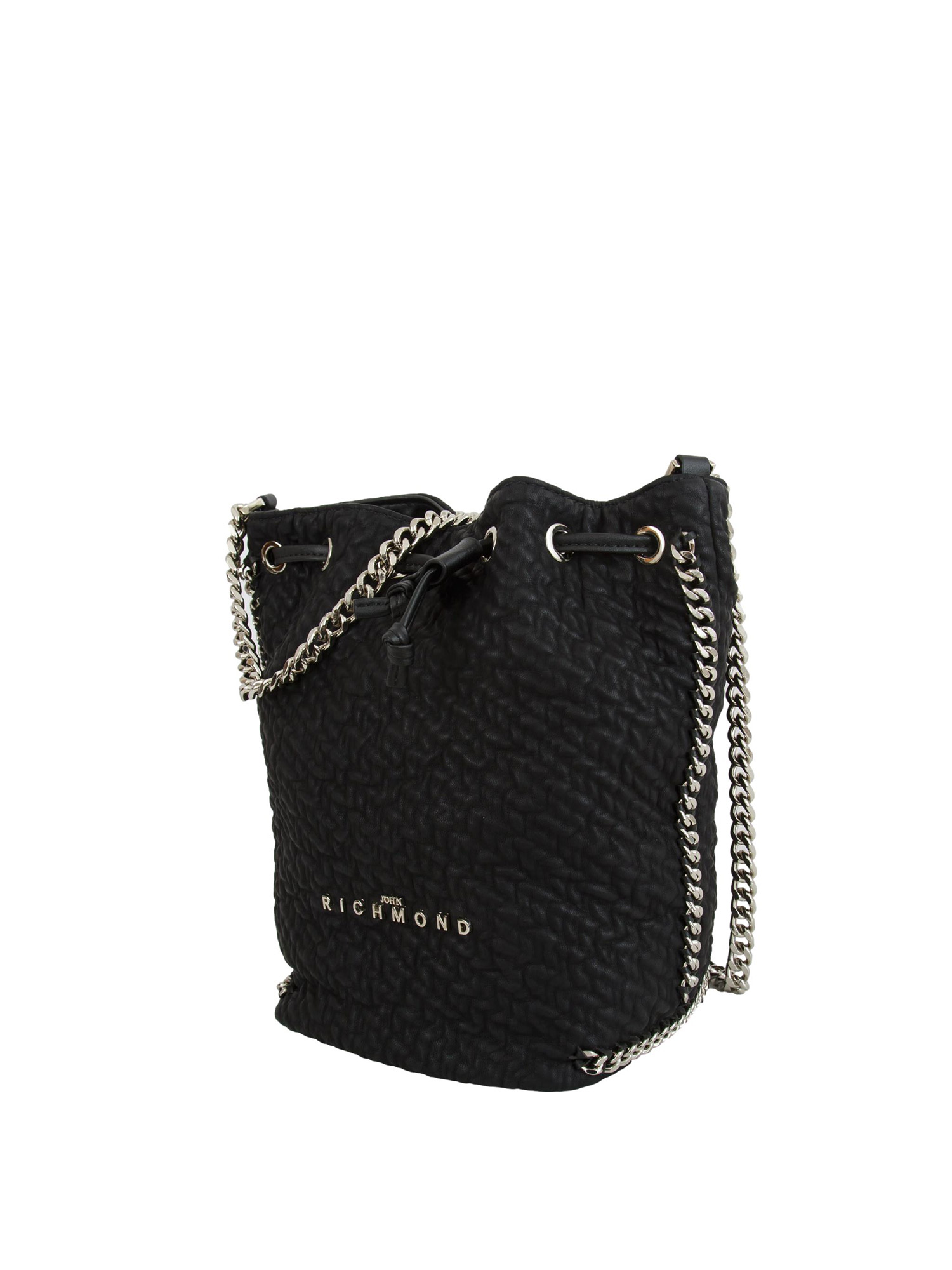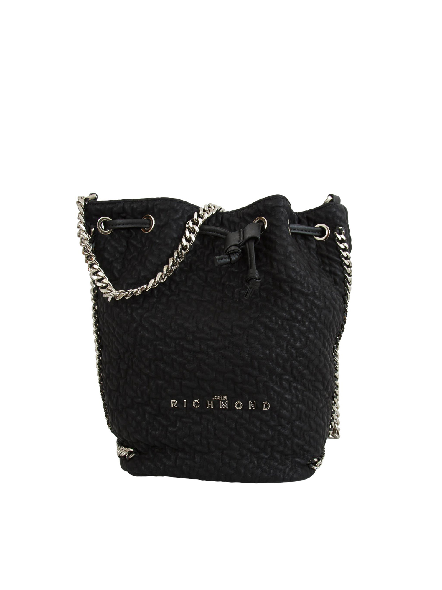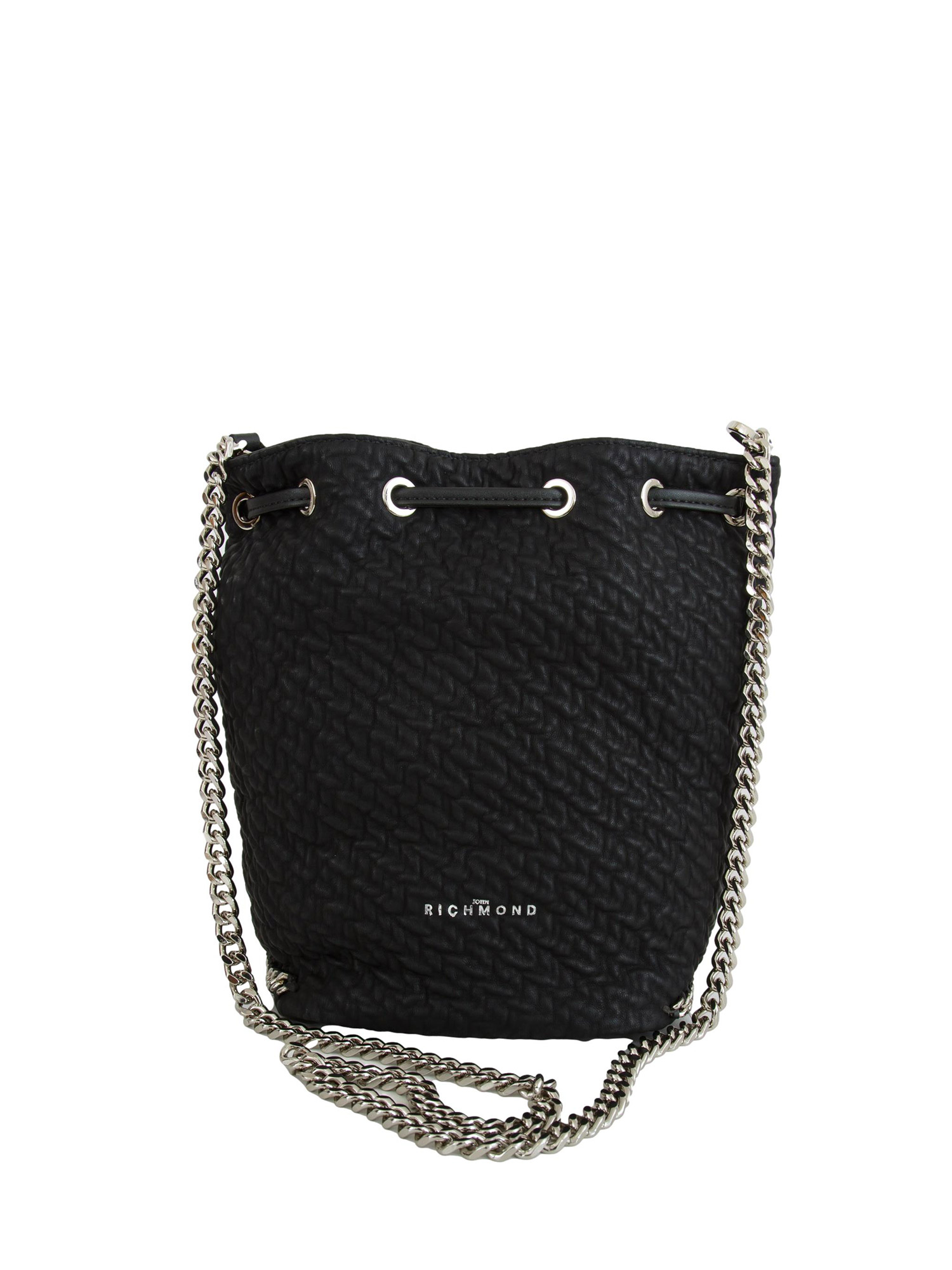 Brand: JOHN RICHMONDBorsa a secchiello John Richmond in ecopelle con lavorazione intrecciata. Dotata di tracolla a catena argento e chiusura con coulisse. Logo lettering sul davanti e sul dietro ed inserti catena sul fondo laterale. Dimensioni: 20 x 25 x 7