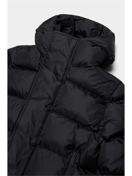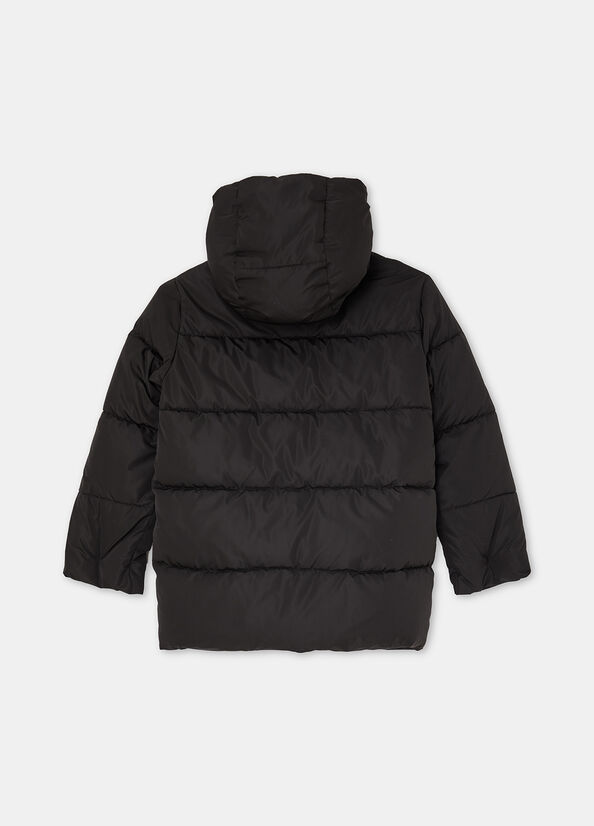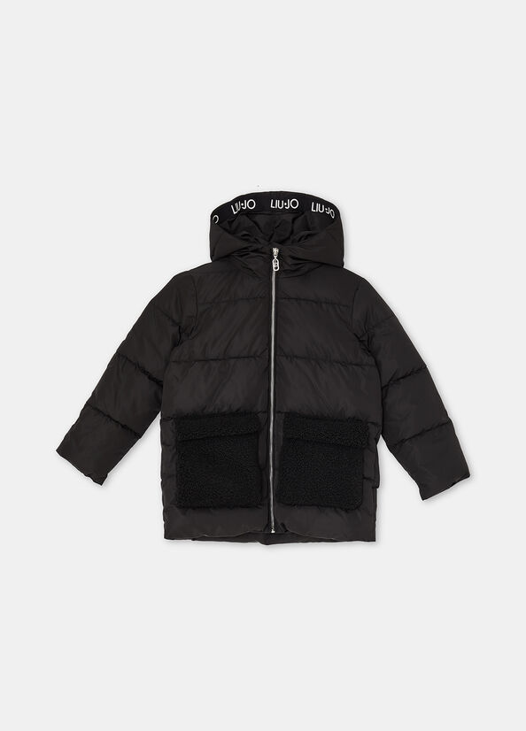 Cappotto in nylon trapuntato, imbottitura in ovatta, collo alto con cappuccio e logo, tasche con patta in teddy e chiusura con zip a doppio cursore.