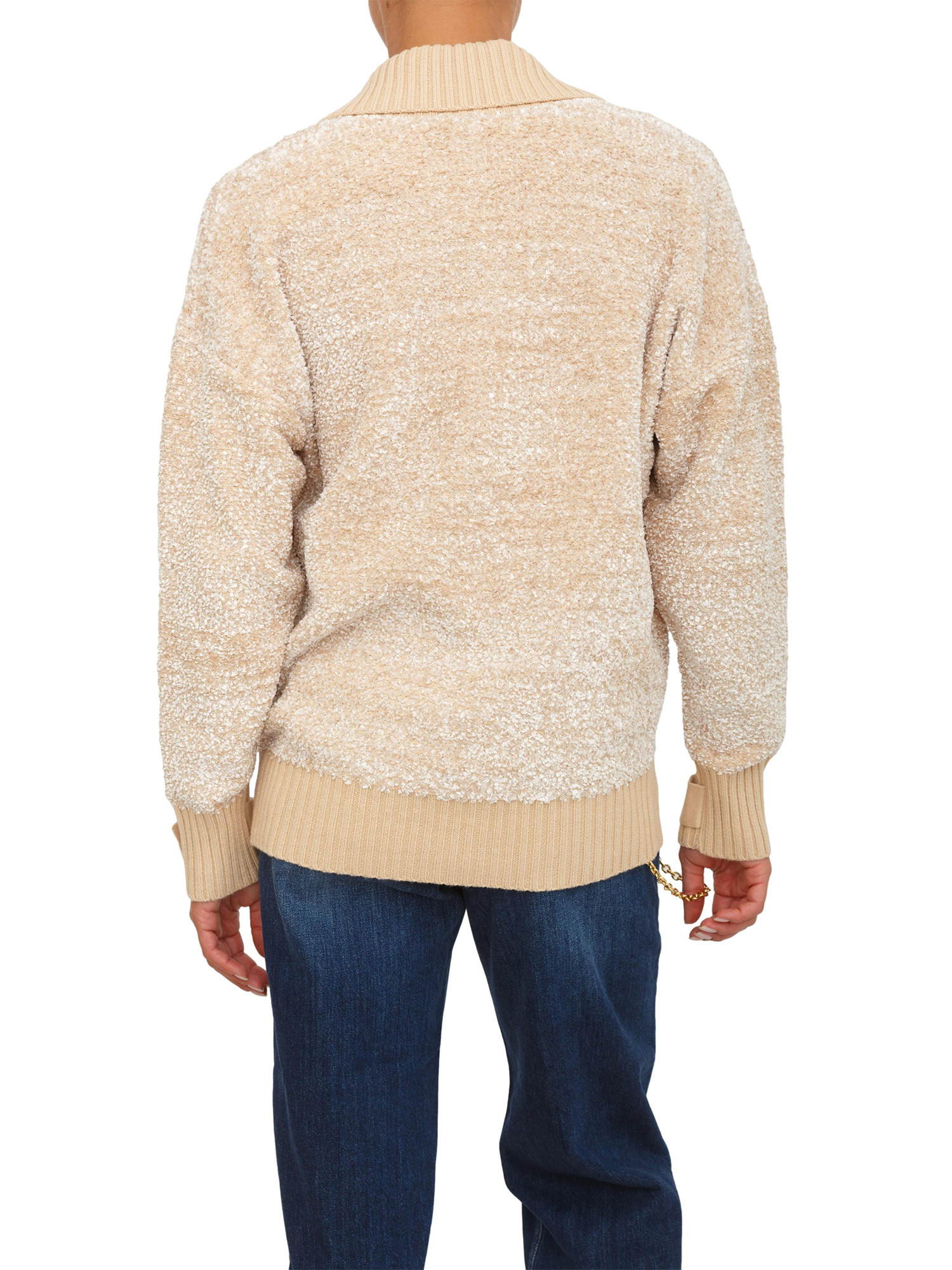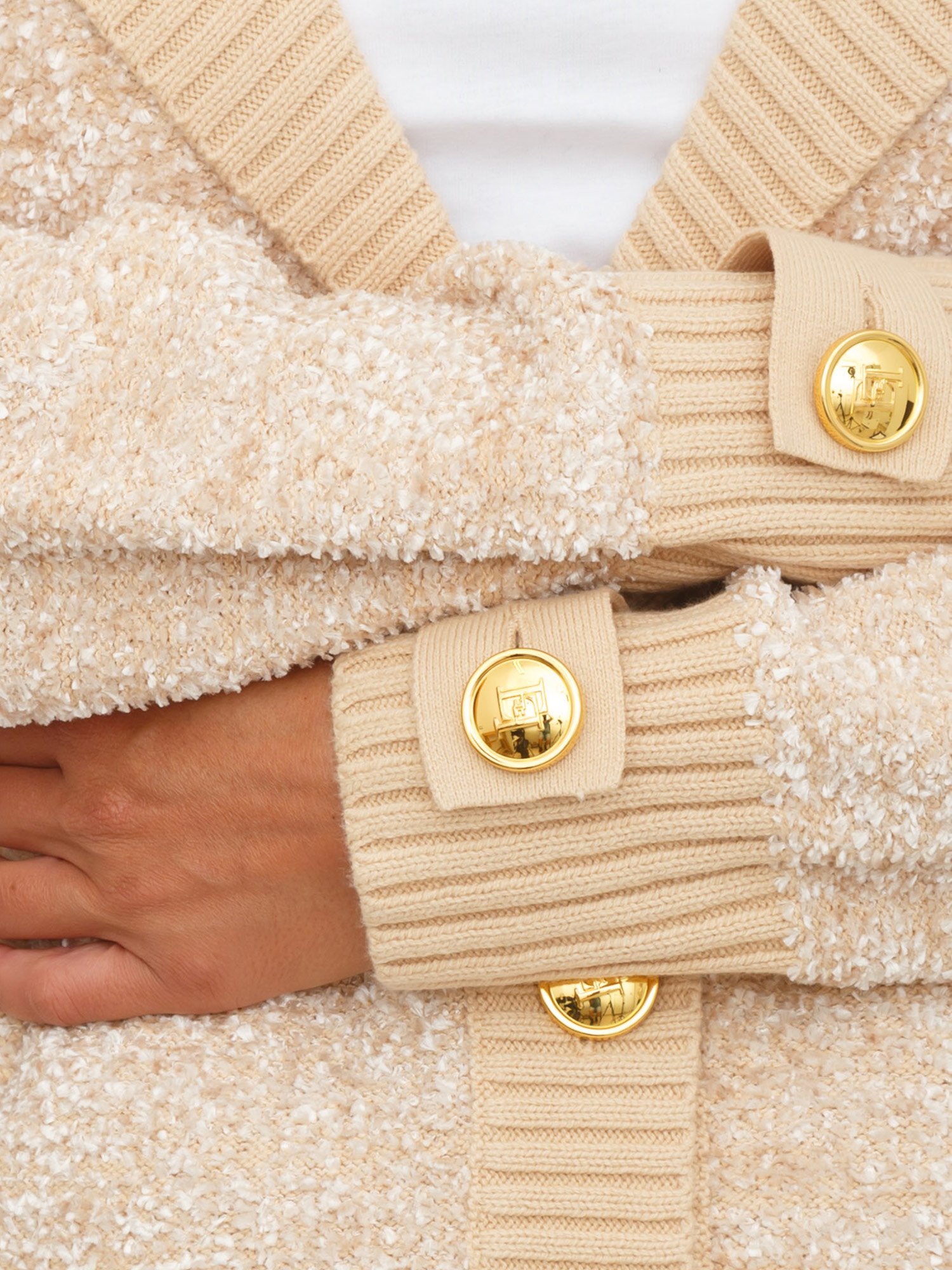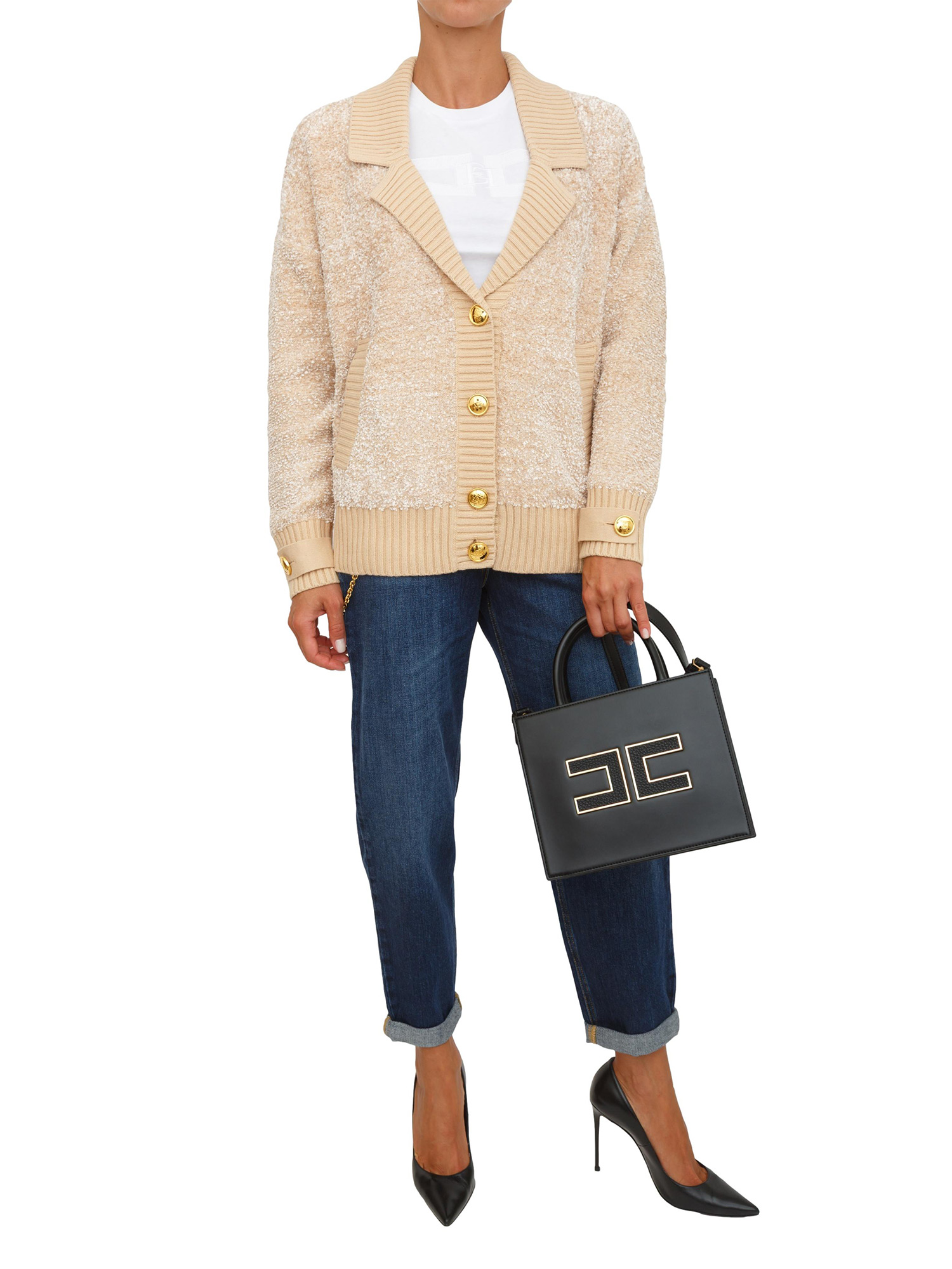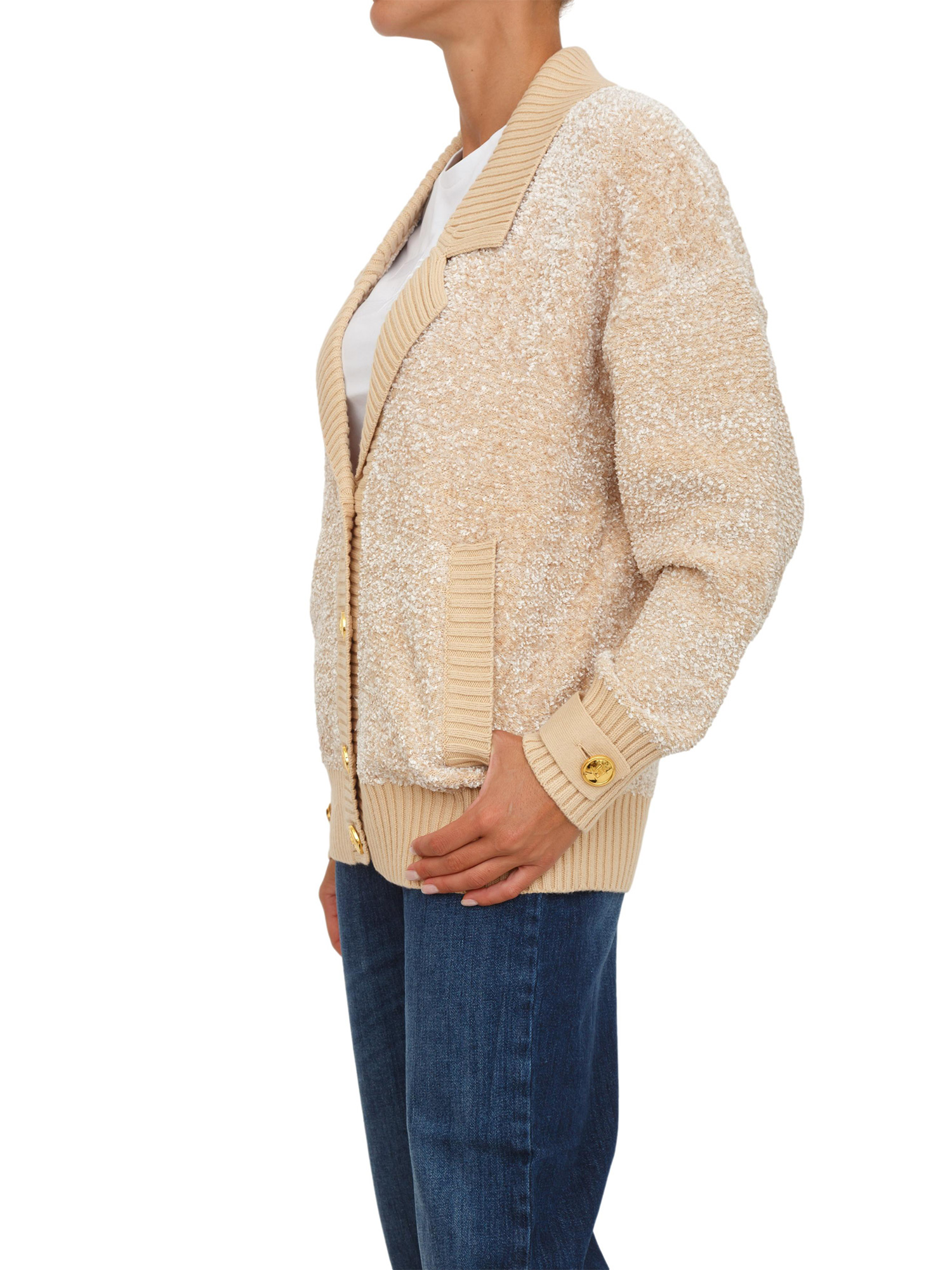 Cardigan Elisabetta Franchi in ciniglia bouclé beige con bottoni gioiello