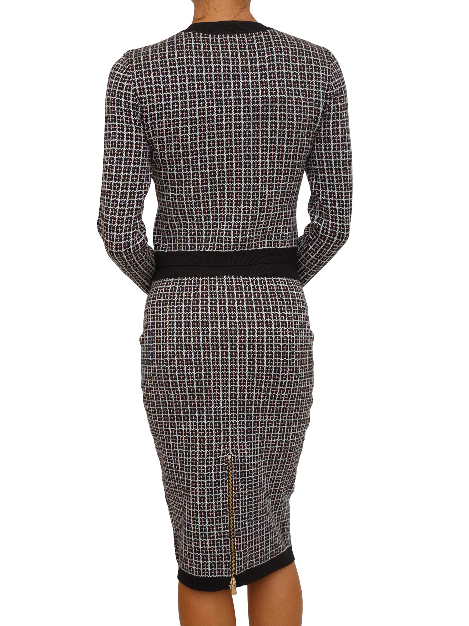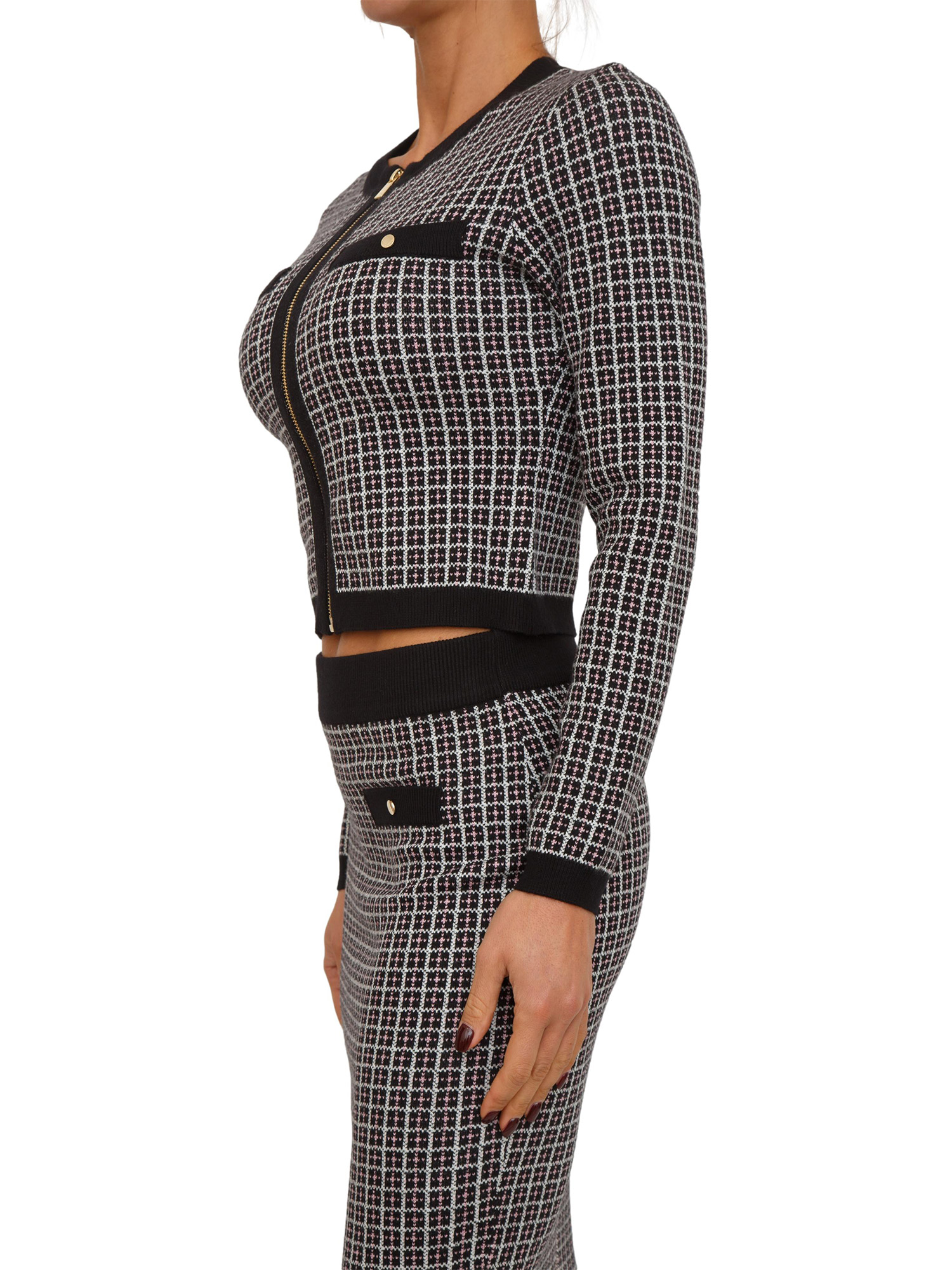 Brand: FRACOMINACardigan Fracomina modello cropped aderente realizzato in maglia di viscosa con motivo jacquard geometrico. Design con girocollo, zip centrale dorata e patte finte tasche sul petto. Bellissimo. La modella è alta 1.72 e indossa la taglia S.