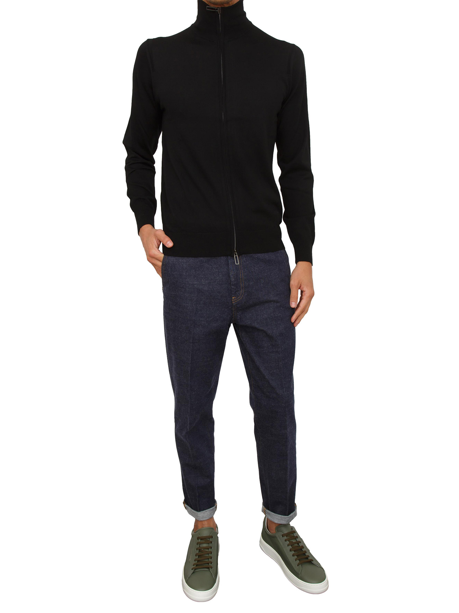 Brand: PAOLO PECORACardigan Paolo Pecora in lana merino extrafine con zip frontale, pensato per garantire morbidezza e calore. Il design con collo alto, chiusura a doppio cursore e bordi a costine uniscono praticità ed eleganza contemporanea. Un capo versatile. Il modello è alto 1.90m e indossa la taglia L.