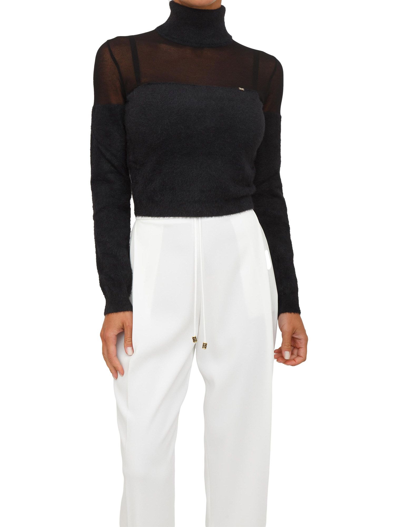 Brand: ELISABETTA FRANCHIDolcevita cropped Elisabetta Franchi con vestibilità aderente. Particolare lavorazione con texture effetto pelo e trama garzata sulle spalle che crea morbidi giochi di trasparenze. Impreziosito dal dettaglio con logo, illuminato da piccoli strass. La modella è alta 1.72 e indossa la taglia 42.