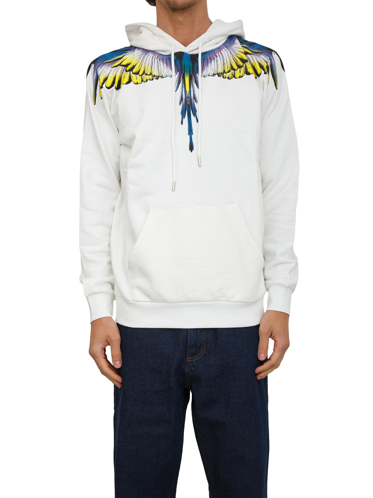 Brand: COUNTY OF MILANFelpa uomo con cappuccio County of Milan realizzata in cotone con stampa aquila multicolor fronte e retro. Dotata di tasca a marsupio, cappuccio regolabile con coulisse e finiture a costine. Il modello è alto 1.90m e indossa la taglia M.