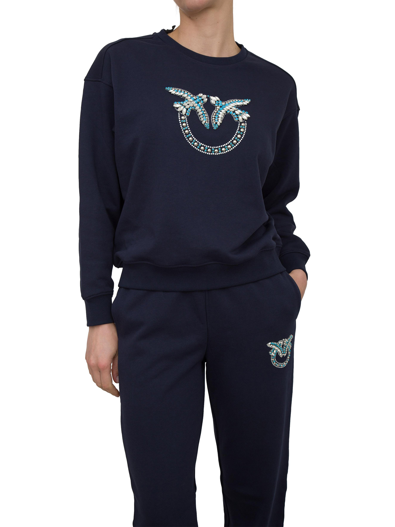 Felpa Pinko blu con girocollo e ricamo gioiello Love Birds