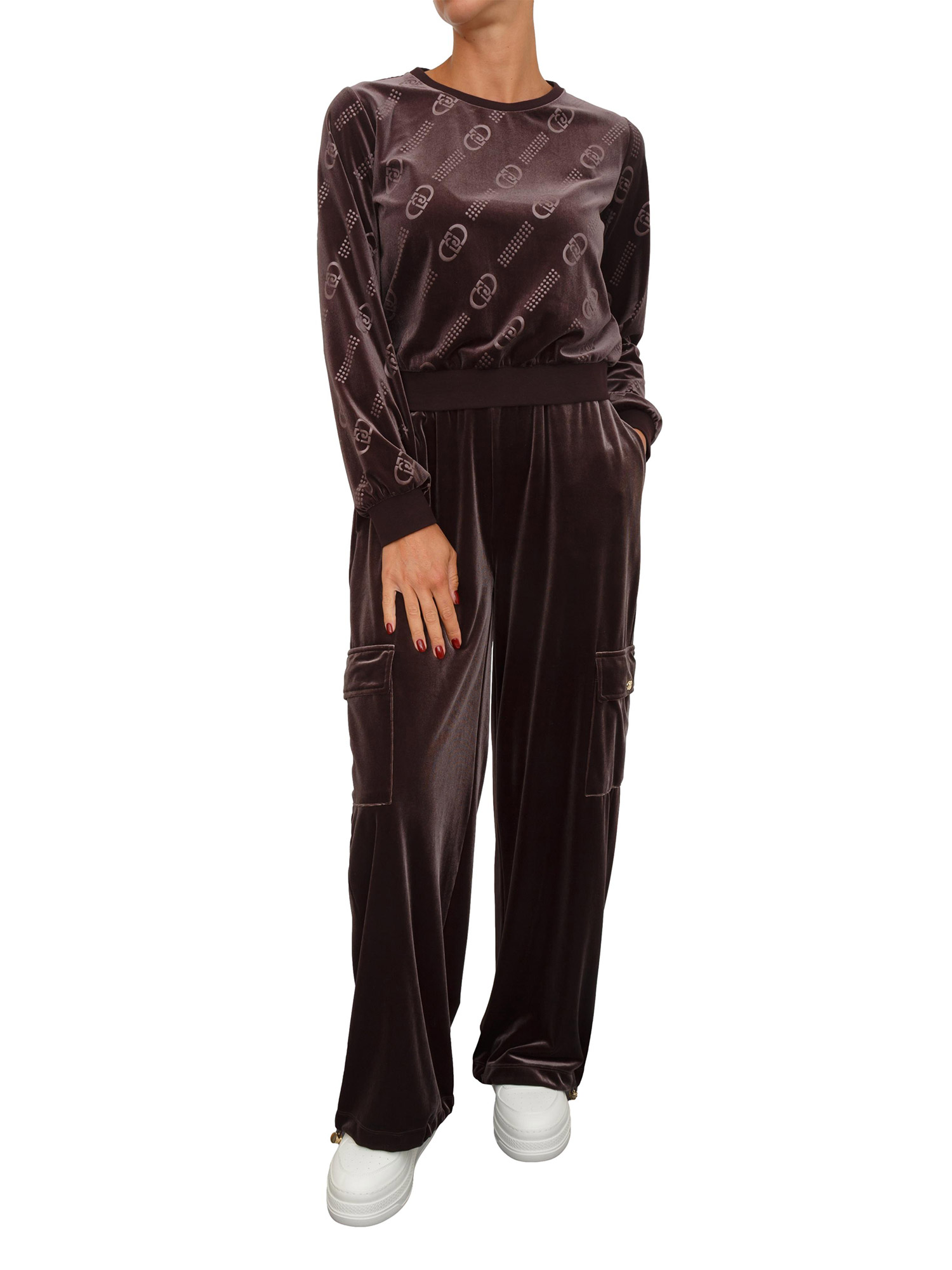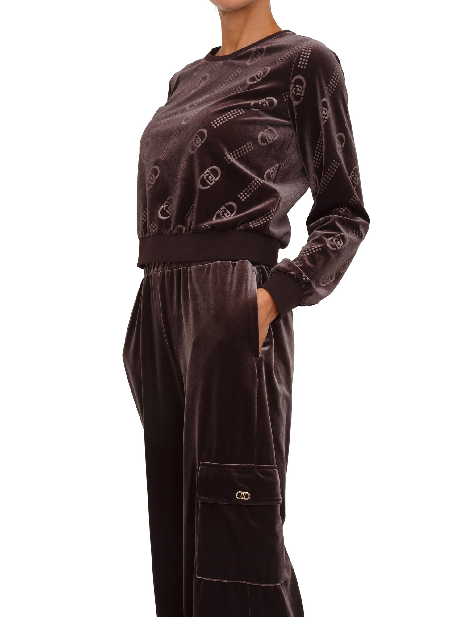 Felpa girocollo Liu Jo donna in ciniglia marrone logo all over