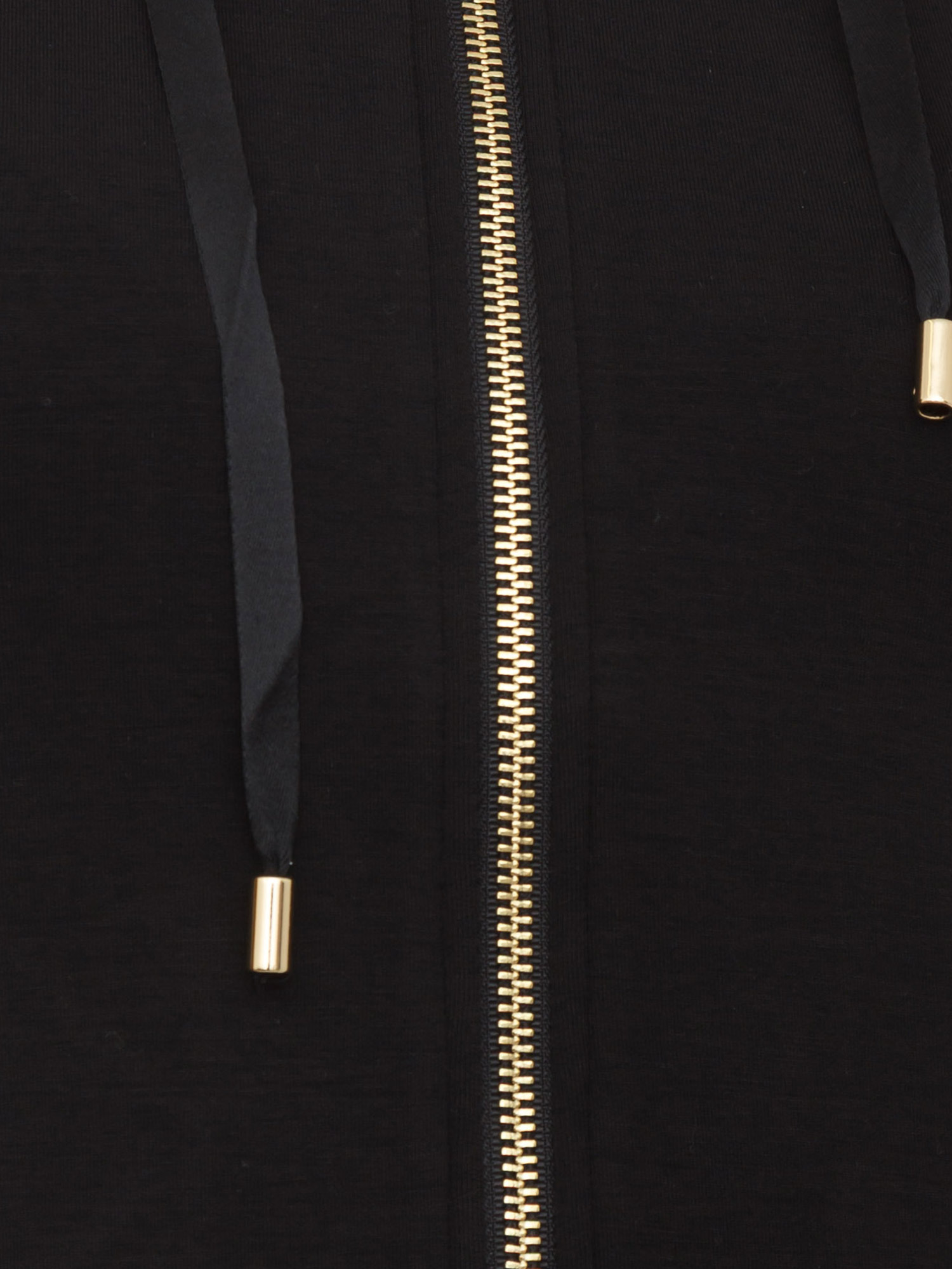 Brand: LIU JOFelpa Liu Jo donna realizzata in cotone con cappuccio e maniche con bordo lovorato con strass logo. Dotata di zip, cappuccio con coulisse con lacci e tasche laterali. La modella è alta 1.72 e indossa la taglia XS.
