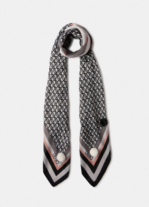 Foulard Liu Jo nero con stampa logo patchwork e pompon
