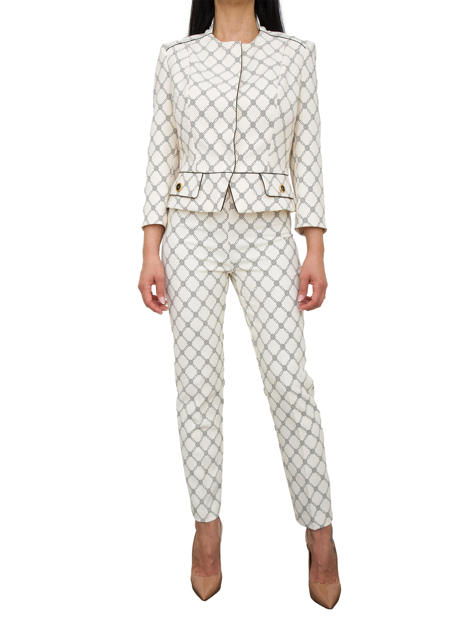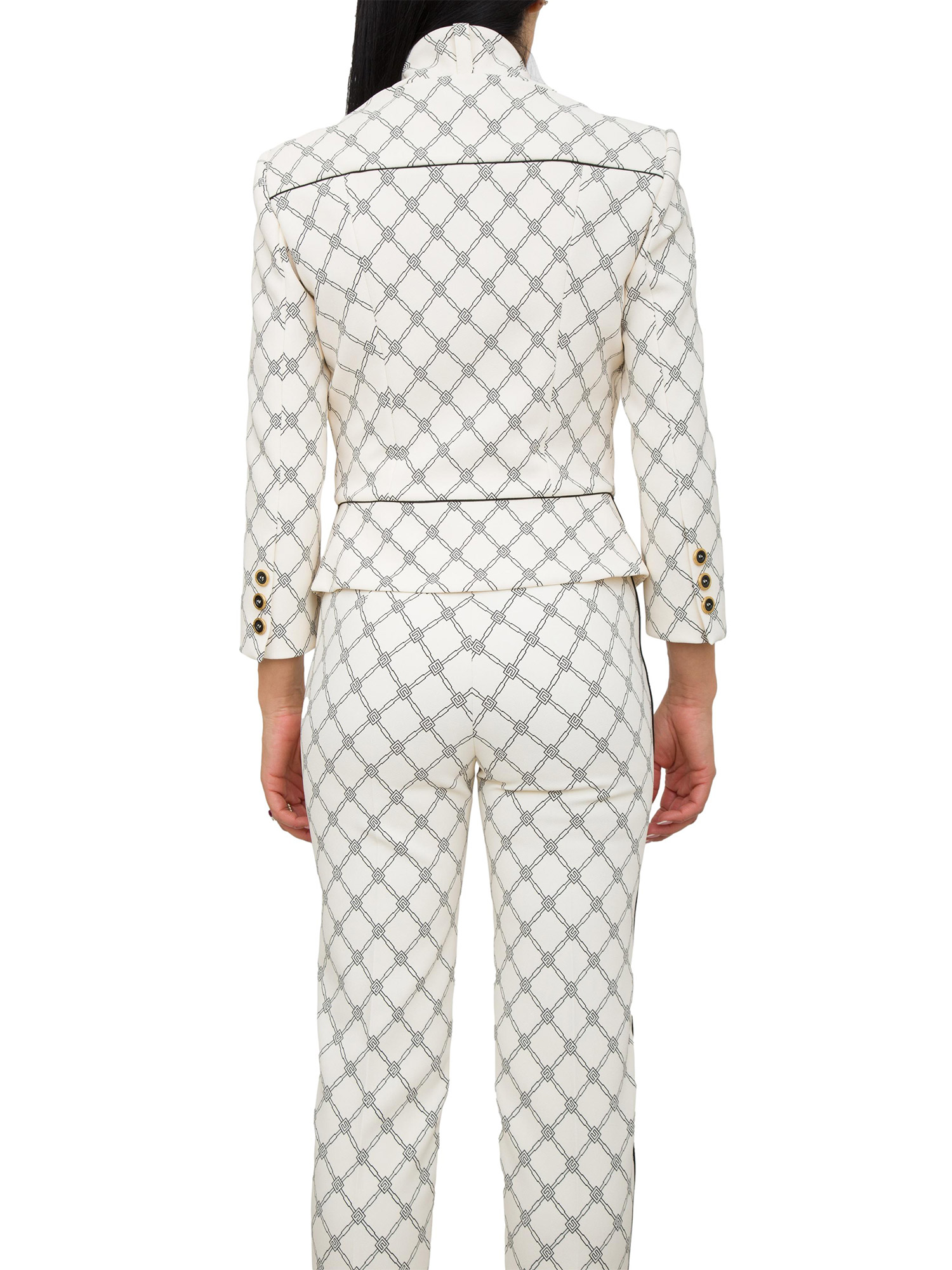 Brand: ELISABETTA FRANCHIGiacca in crêpe stretch con stampa all-over a losanghe e piping a contrasto. È resa unica dal foulard amovibile, impreziosito dalla decorazione gioiello in metallo dorato con logo. Ha collo a camicia, maniche ¾ e baschina con patte. Bottoni con ghiera in metallo dorato. Vestibilità slim.