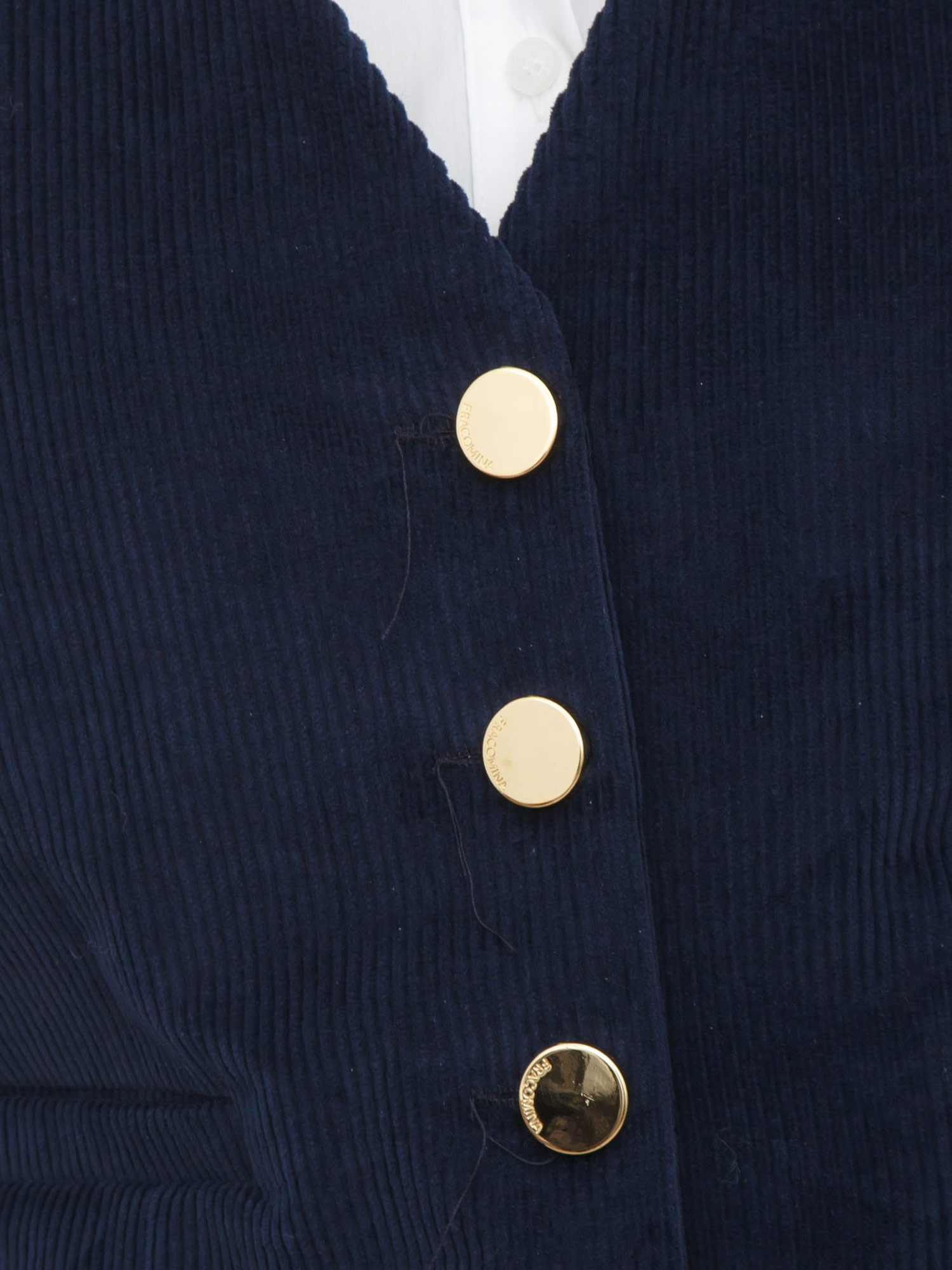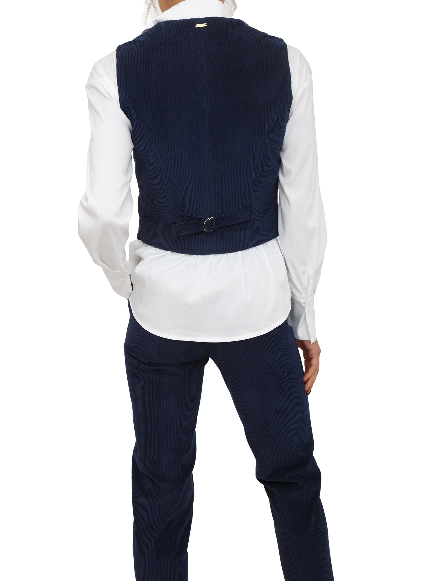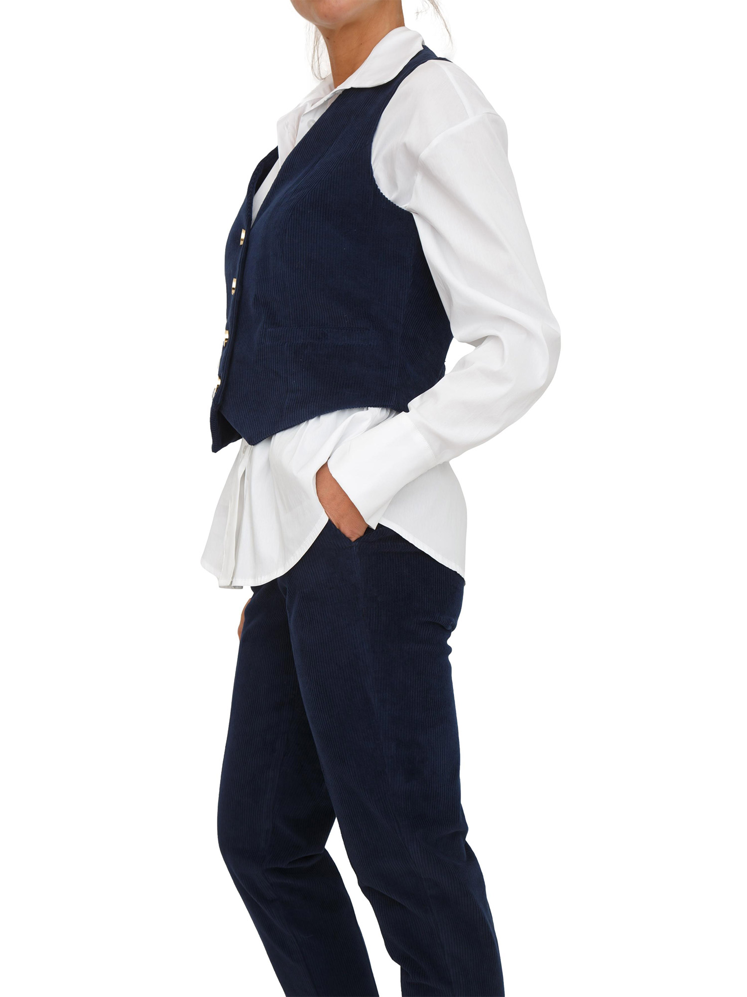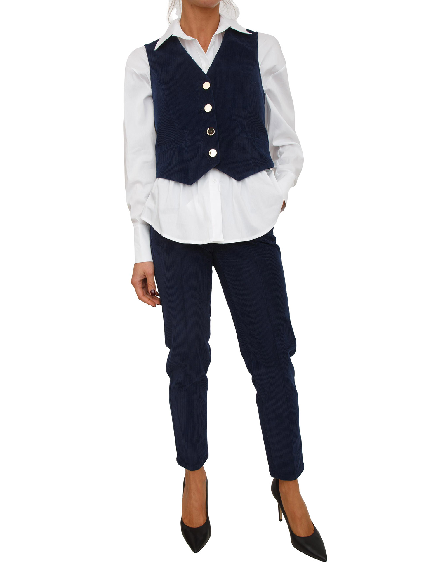Brand: FRACOMINAGilet donna Fracomina con vestibilità regular realizzato in velluto mille righe. Design con scollo a V, bottoni centrali dorati, tasche a filetto e martingala sul dietro. Stupendo per completare i tuoi look. La modella è alta 1.72 e indossa la taglia M.