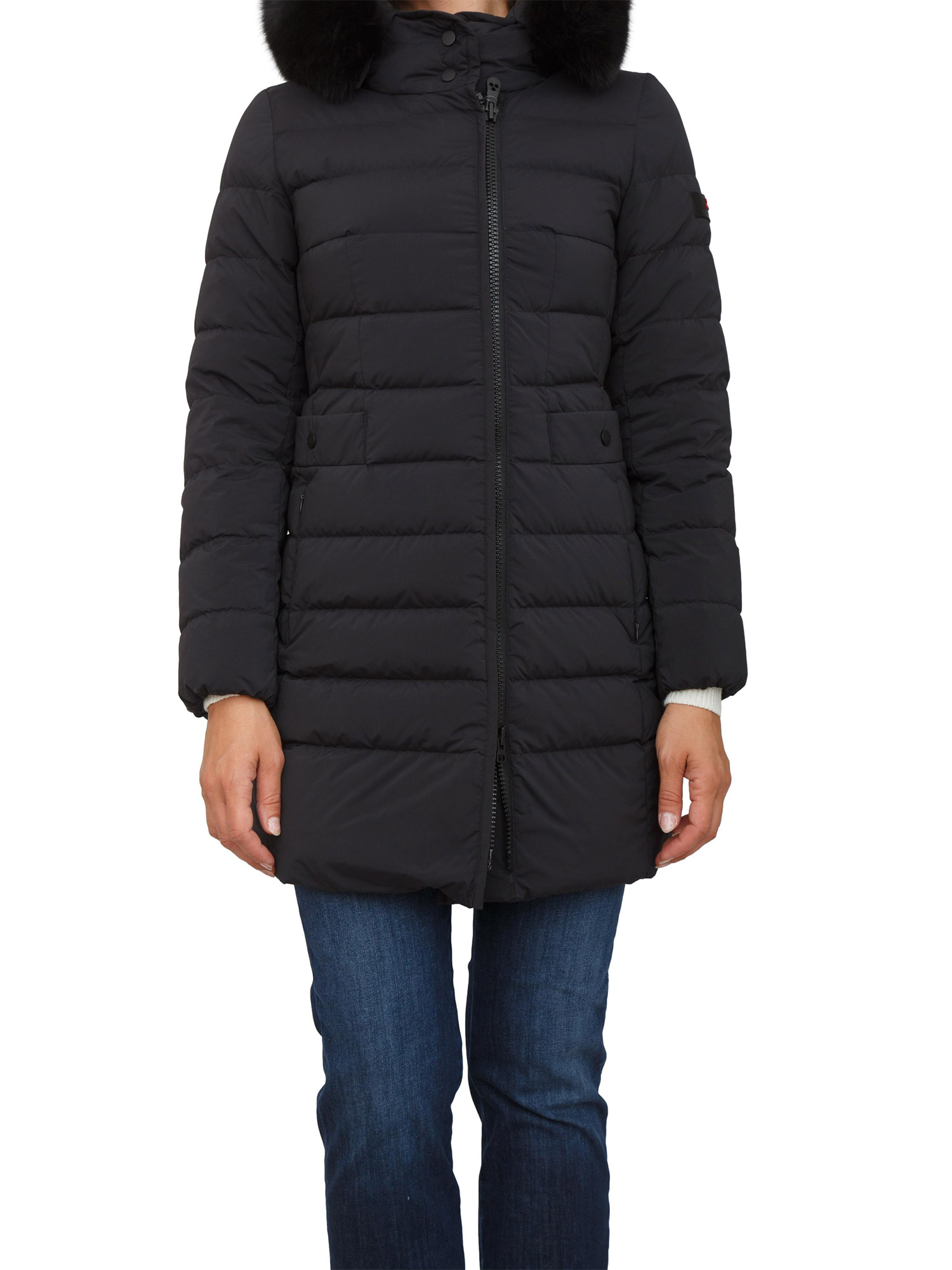 Brand: PEUTEREYPiumino lungo trapuntato Peuterey in leggero popeline di nylon e microfibra di poliestere dalla mano sostenuta e tatto polveroso. Imbottitura in piuma naturale certificatae trattamento idrorepellente. Zip centrale a doppio cursore, tasche laterali con bottone, collo avvolgente con bottoni a pressione e cappuccio con bordo in pelliccia di volpe removibile. La modella è alta 1.77 e indossa la taglia 40.