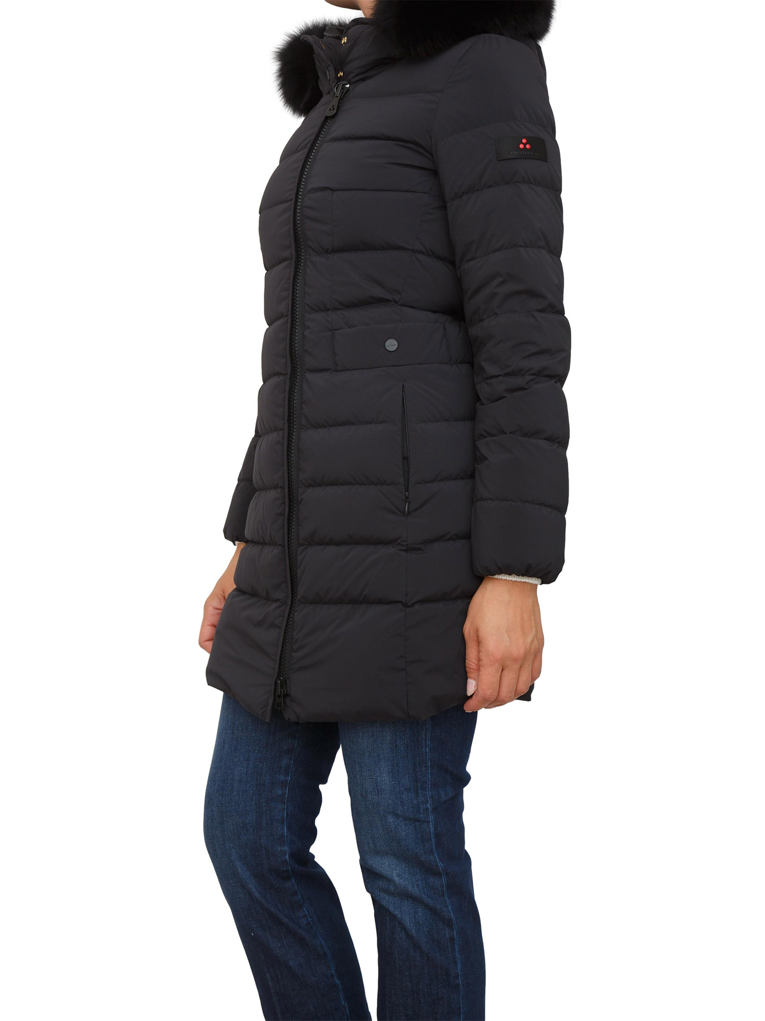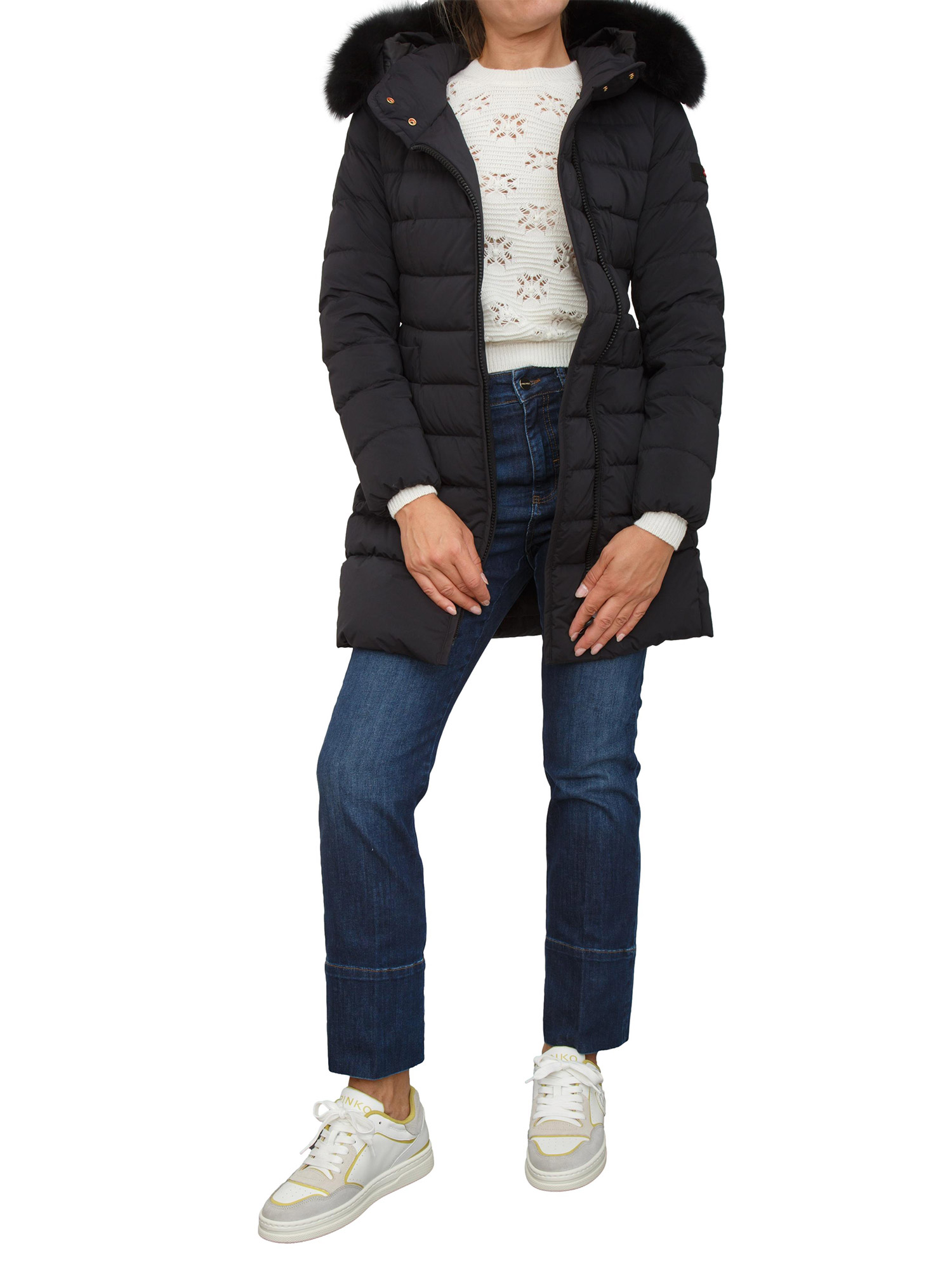 Piumino lungo blu in piuma naturale Peuterey con collo alto e pelliccia volpe removibile