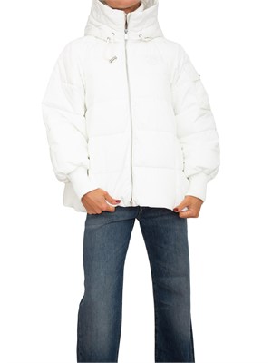 Piumino Pinko in tela tecnica con fit leggermente a campana. Look più sportivo con finishing opaco, tasche con zip invisibile e lavorazione a costine su collo e polsini. Dotato di cappuccio con coulisse, patch con logo davanti e chiusura con zip a doppio cursore. La modella è alta 1.72 e indossa la taglia XS.