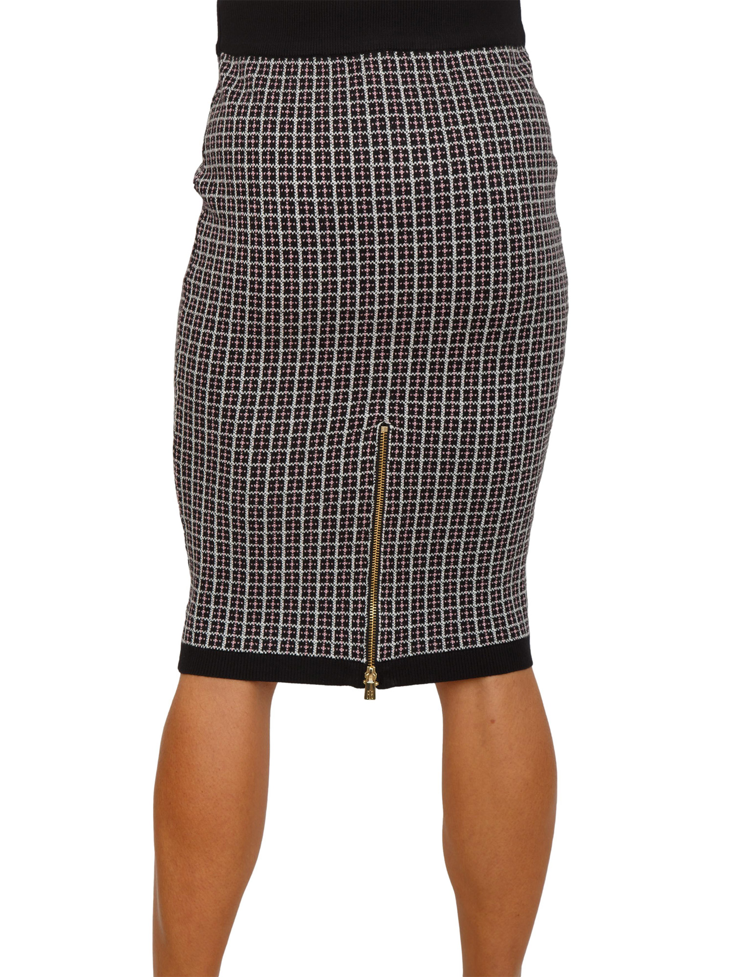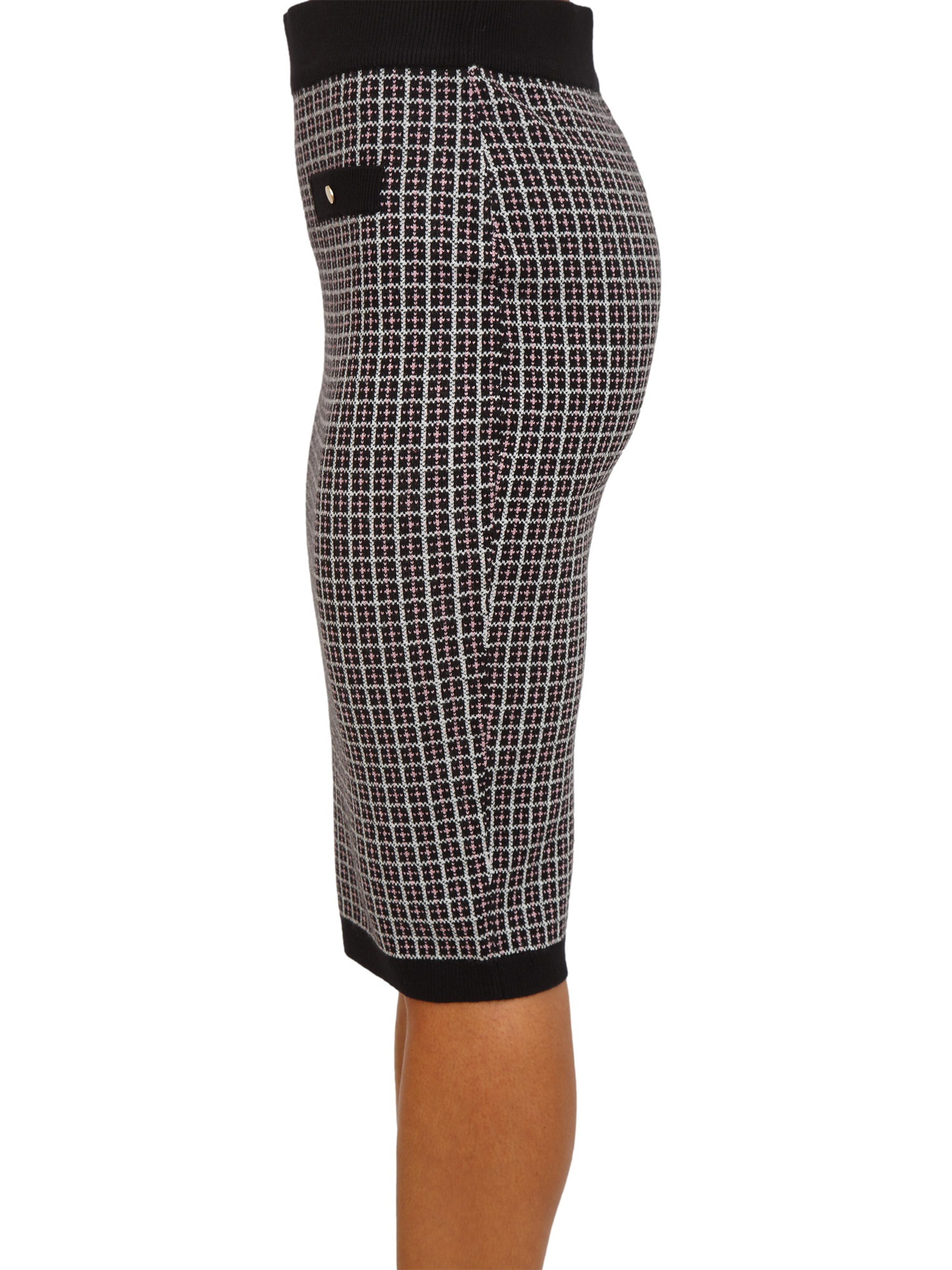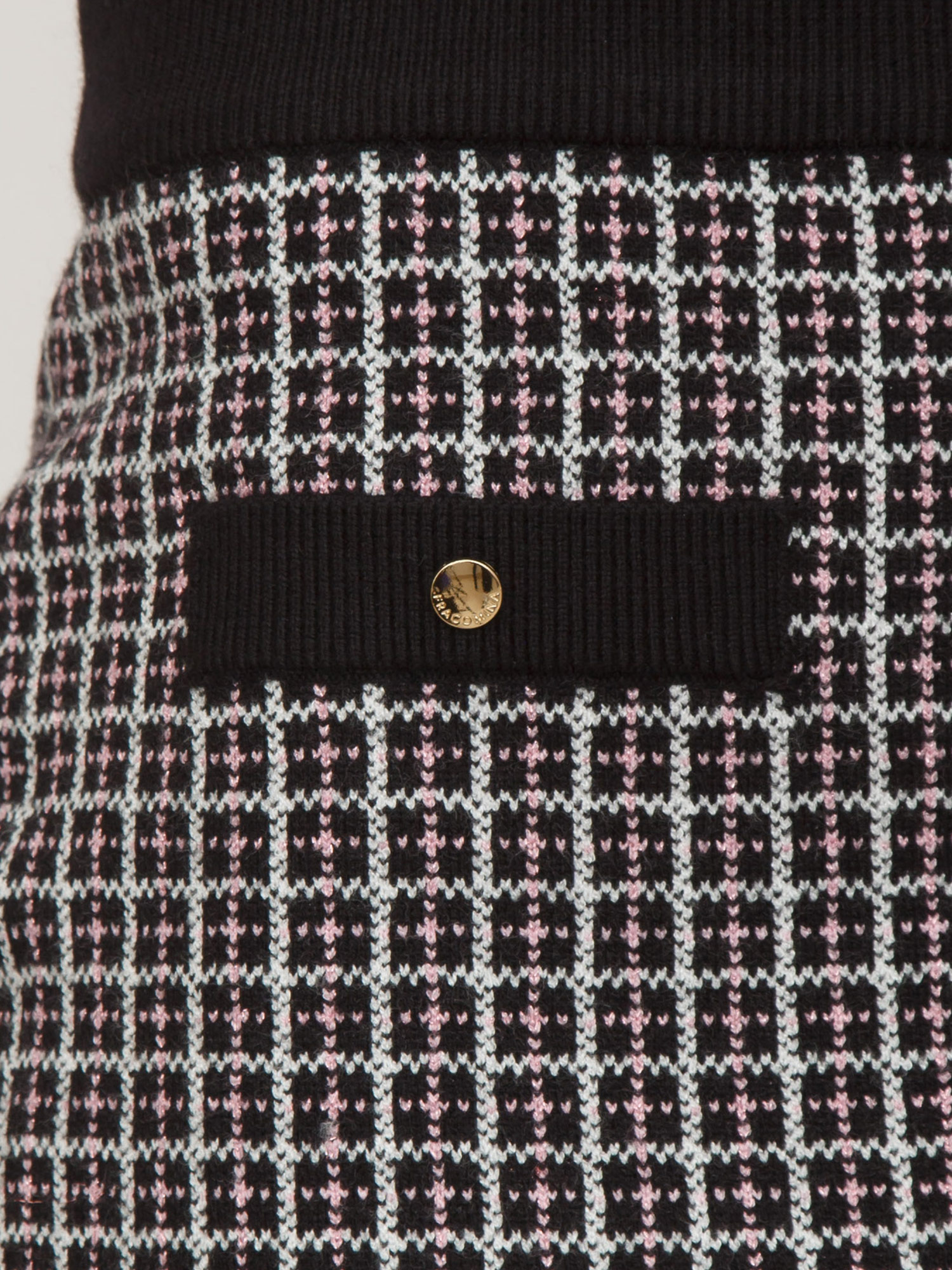 Brand: FRACOMINAGonna midi Fracomina realizzata in maglia di viscosa con motivo jacquard geometrico e fit aderente. Design dotato di lavorazione a costine sulla vita che ricopre il cinturone elastico e sul fondo, patte per finte tasche e zip dietro sul fondo. La modella è alta 1.72 e indossa la taglia S.