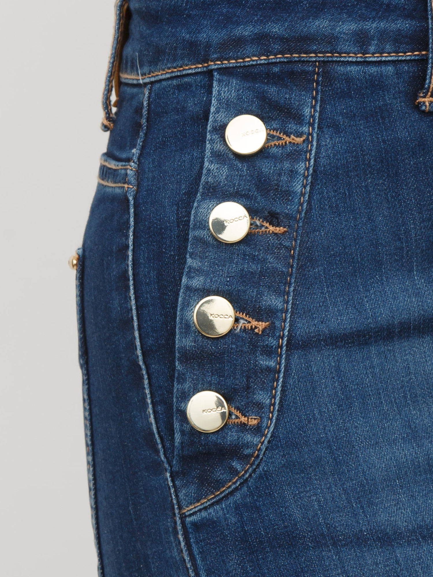 Brand: KOCCAJeans Rooney Kocca modello a zampa d'elefante, caratterizzato da bottoni dorati sulle tasche frontali. Il capo presenta vita alta, vestibilità aderente e chiusura con zip e bottone. Stupendi. La modella è alta 1.72 e indossa la taglia 38.