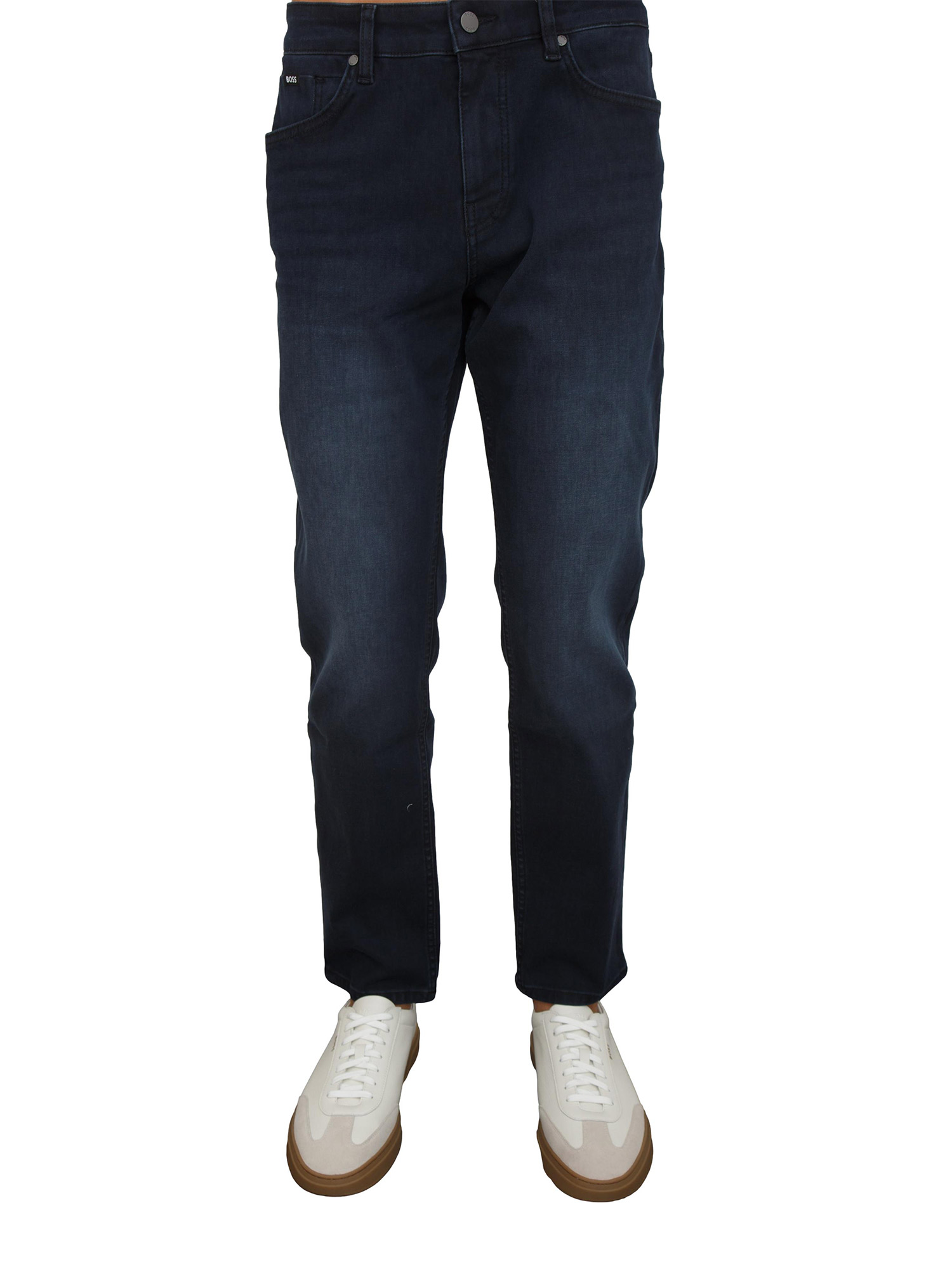 Brand: BOSSJeans regular fit con gamba affusolata BOSS uomo realizzati in comodo denim elasticizzato blu scuro con leggeri effetti usurati. Chiusura con zip e pratiche tasche. Bello e raffinato sotto i tuoi look casual. Il modello è alto 1.90m e indossa la taglia 31.