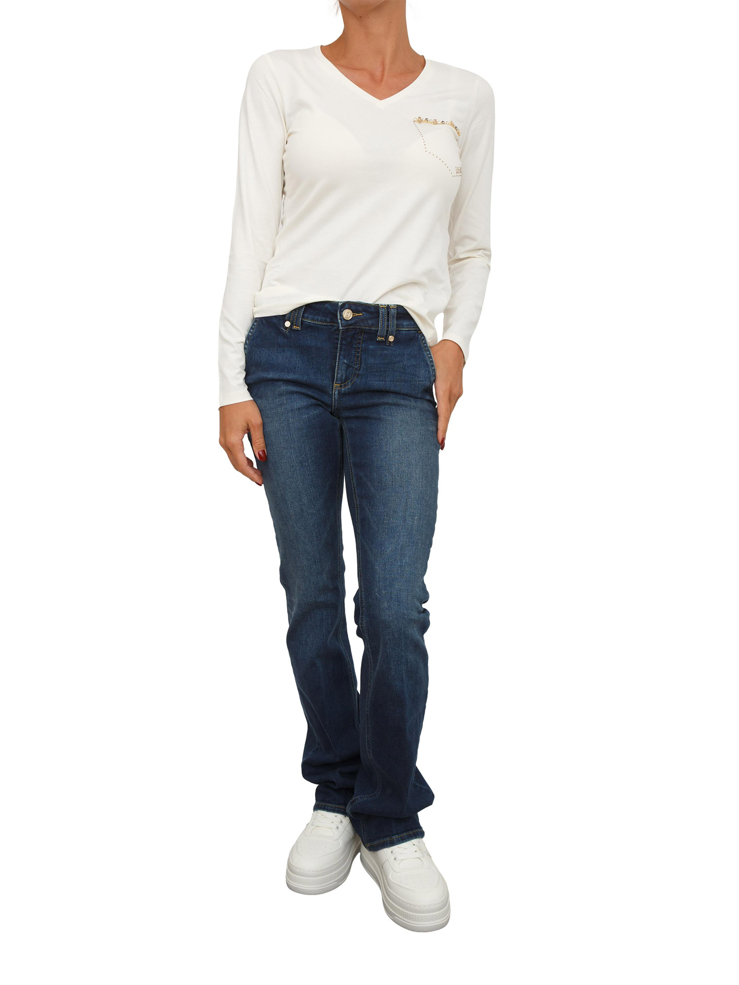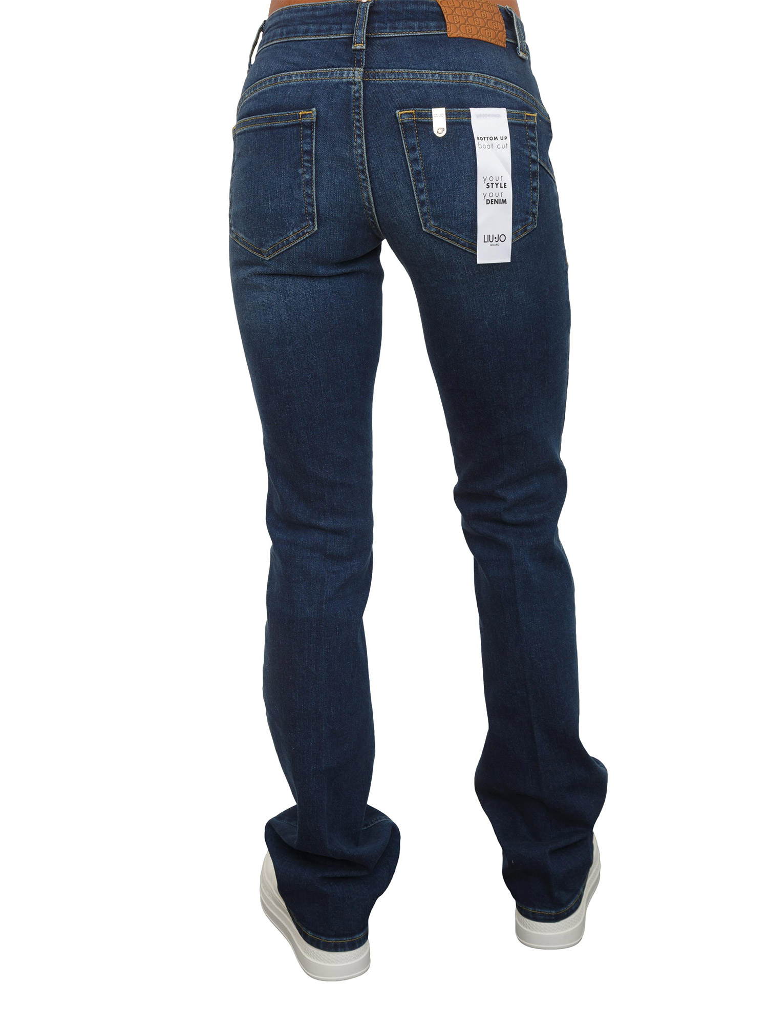 Brand: LIU JOJeans Liu Jo donna realizzati in denim di cotone stretch con tagli bottom up e lavaggio used. Modello a vita bassa, gamba slim che si allarga e salpa logata. La modella è alta 1.72 e indossa la taglia 26.