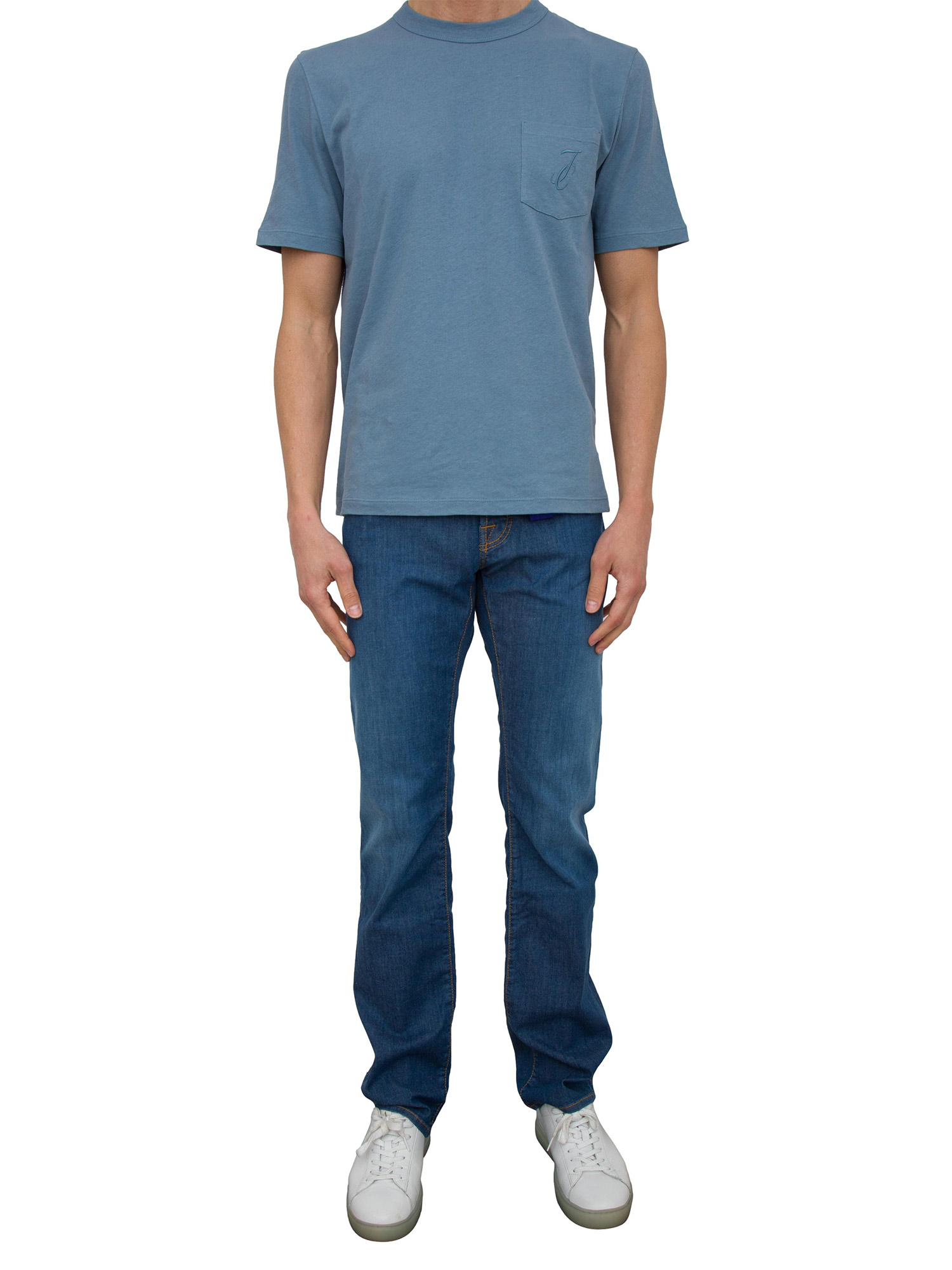 Jeans uomo 5 tasche Jacob Cohen modello Eduard vestibilità regular-slim fit a vita media realizzati in denim di cotone comfort blu con lavaggio bleach, baffature, sabbiatura a mano, spazzolatura totalmente a mano e texture morbida. Salpa in pelle marrone, bianca e verde e bottone oro lavorato. Il modello è alto 1.90m e indossa la taglia 32.