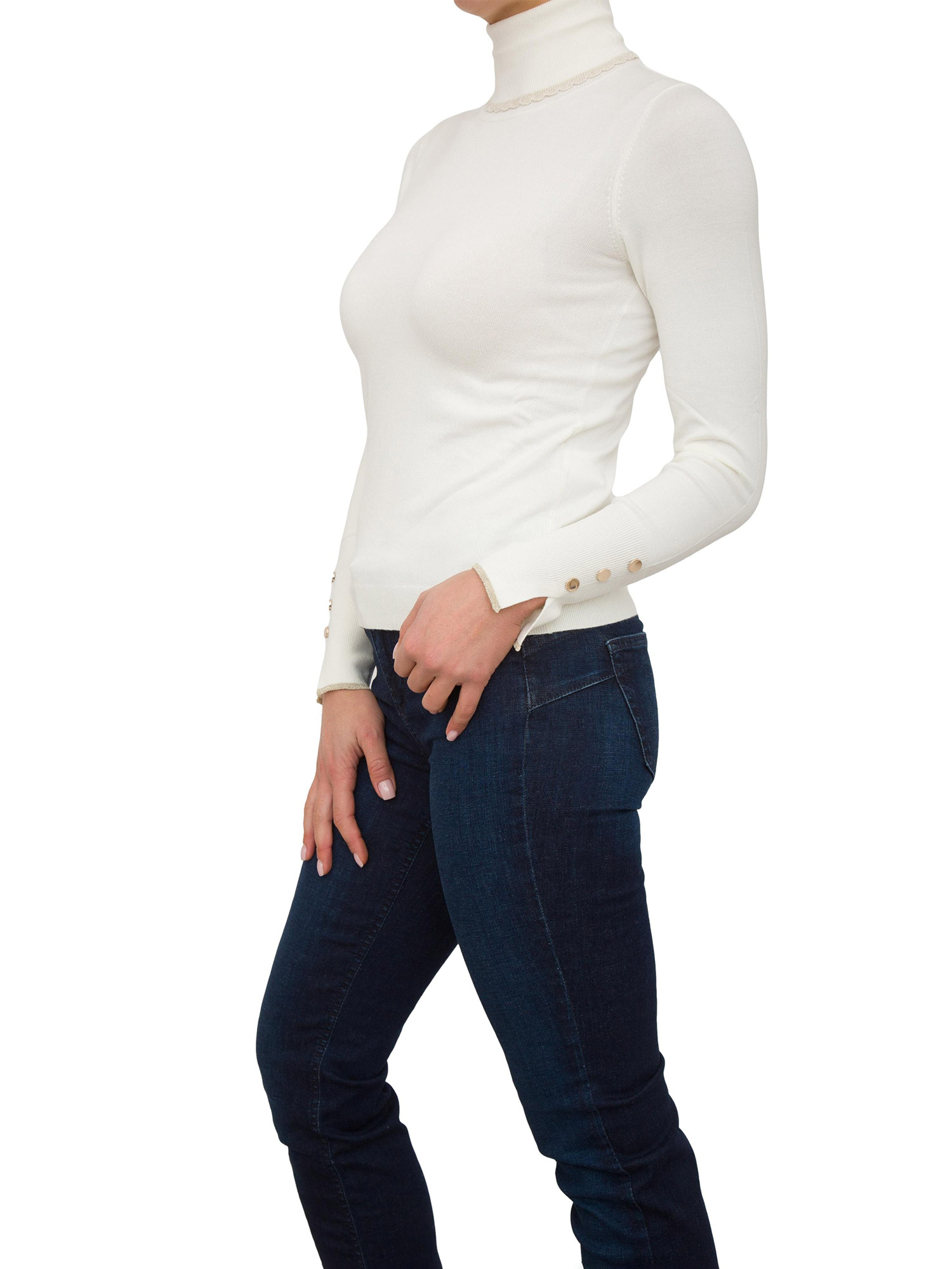 Brand: LIU JOMagia dolcevita Liu Jo realizzata in un pregiato misto viscosa, perfetta per ogni occasione. Con dettagli esclusivi, come gli inserti in lurex che donano un tocco di brillantezza, questa maglia è un must-have nel tuo guardaroba. Il suo collo con motivo grafico, abbinato alle maniche lunghe, crea un look sofisticato e alla moda. I polsi sono arricchiti da spacchetti e bottoni decorativi, mentre il logo con strass sul retro aggiunge un tocco di luce. Ideale per chi cerca un capo versatile e ricercato, che unisce eleganza e praticità.