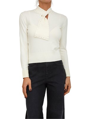 Brand: NENETTEMaglia donna Maestrale Nenette realizzata in viscosa con sciarpina impreziosita da borchiette che aggiungono luce e personalità al modello. Morbida e confortevole, unisce femminilità e carattere in un capo versatile e contemporaneo. La modella è alta 1.72 e indossa la taglia XS.