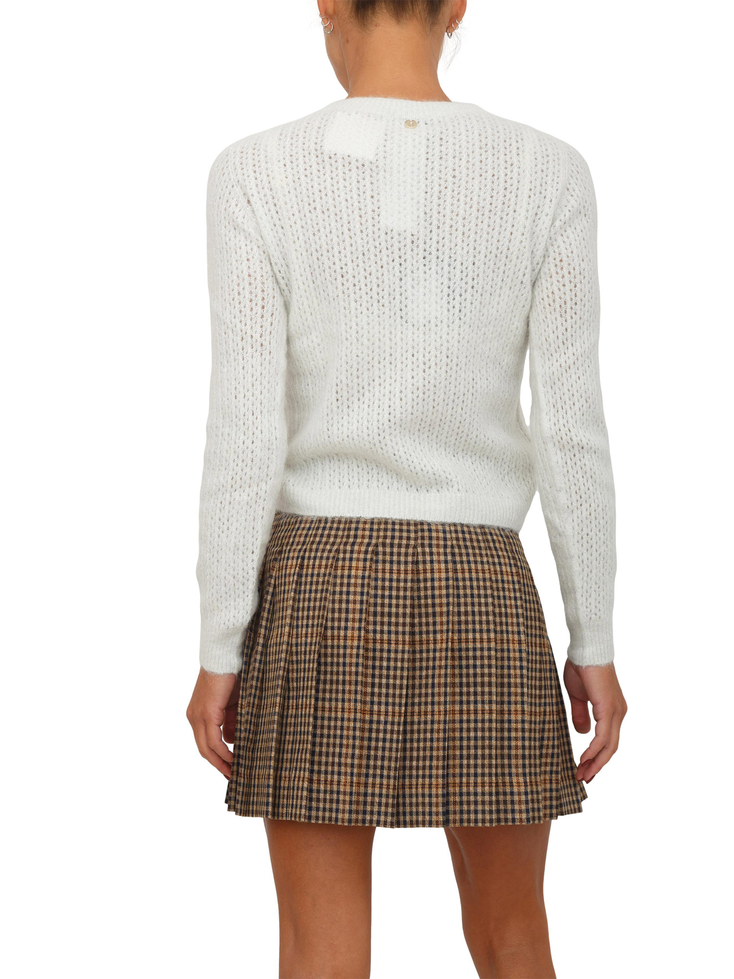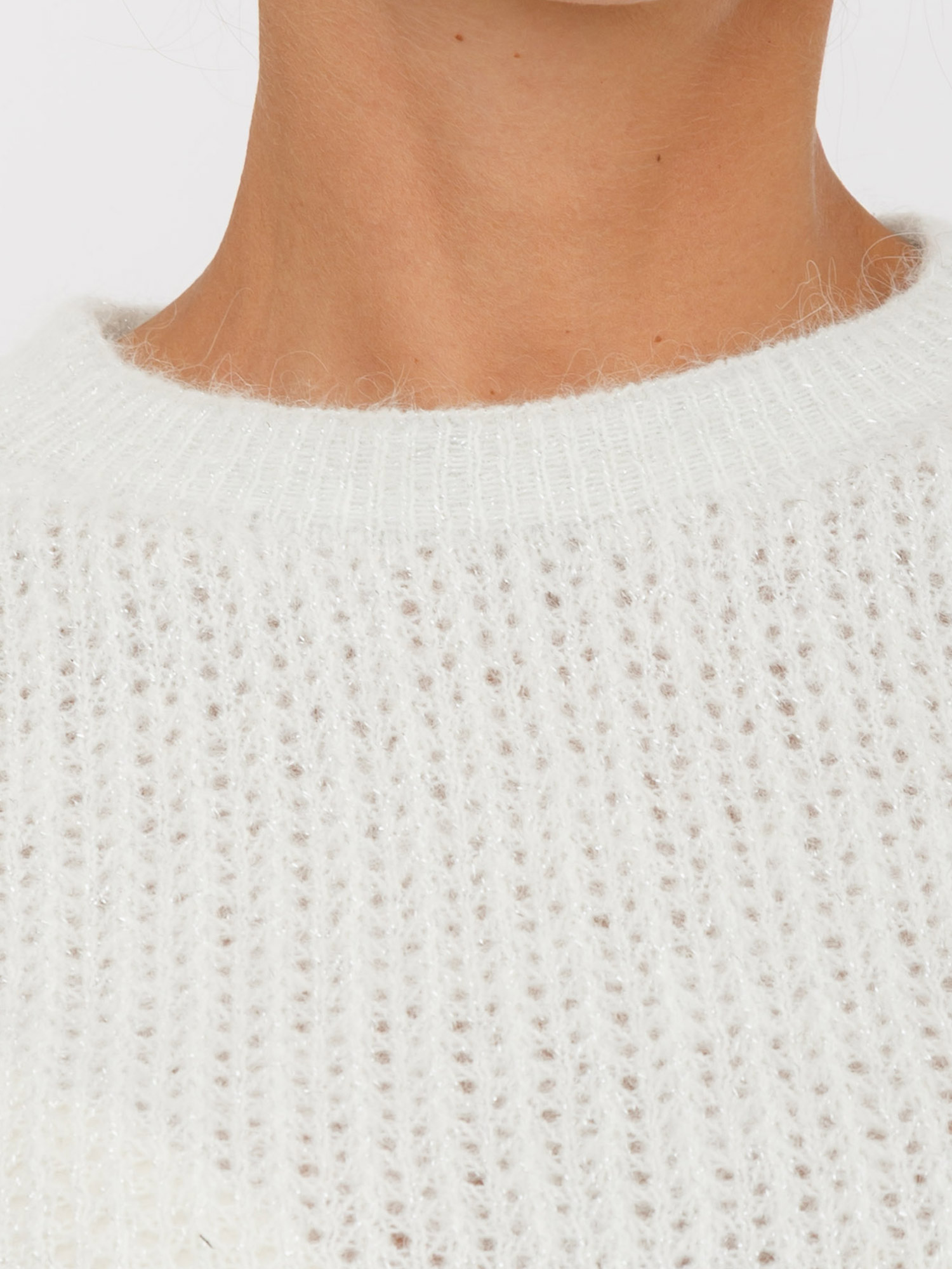 Brand: LIU JOMaglia girocollo Liu Jo donna realizzata in morbidi filati di alpaca e lana con inserti in lurex. Vestibilità morbida con lavorazione traforata per esaltare la tua femminilità. Girocollo e fondi lavorati a costine. La modella è alta 1.72 e indossa la taglia XS.