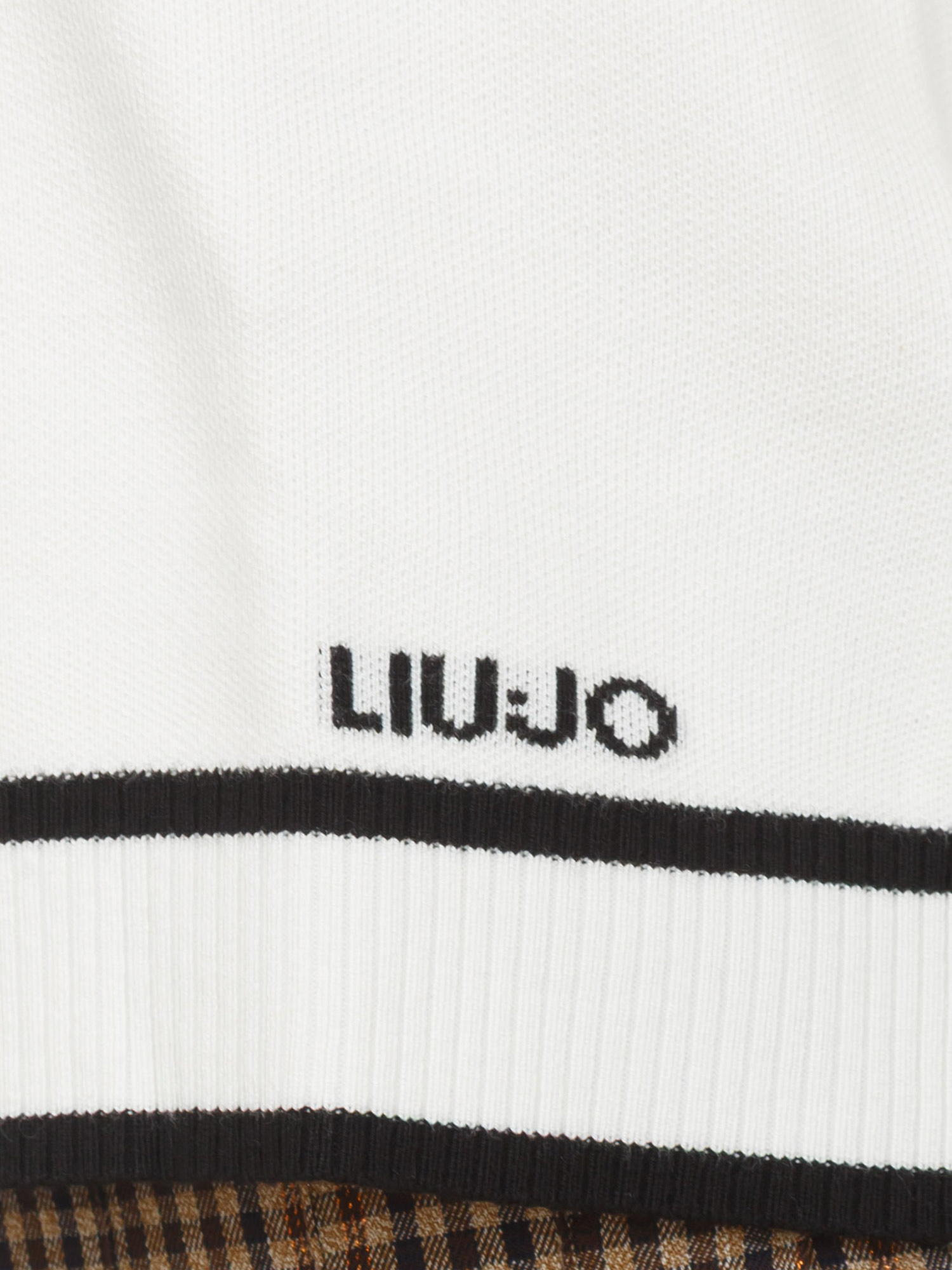 Brand: LIU JOMaglia scollo V Liu Jo donna realizzata in misto seta con fit dritto e morbido. Design con motivo righe a contrasto sui bordi, arricchito da bottoni dorati sulle maniche e logo jacquard a contrasto. La modella è alta 1.72 e indossa la taglia XXS.
