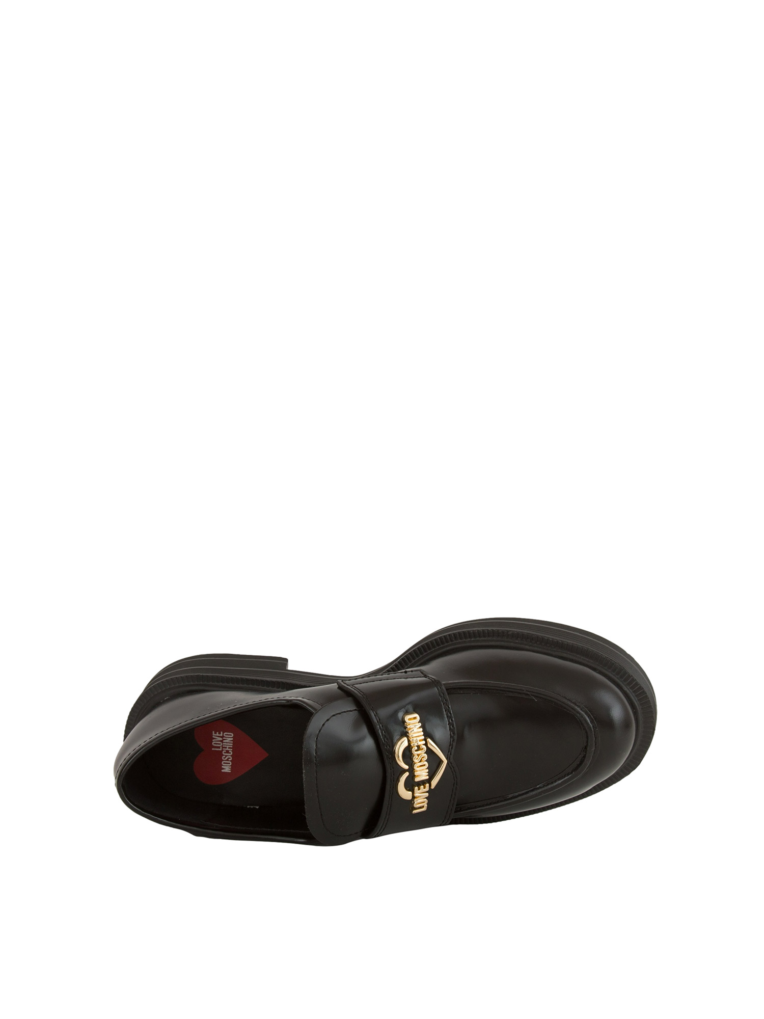 Brand: LOVE MOSCHINOMocassino donna Love Moschino in vitello spazzolato, logo Lettering con cuore spezzato in metallo e fondo in gomma dal volume importante. Altezza del tacco : 4 cm