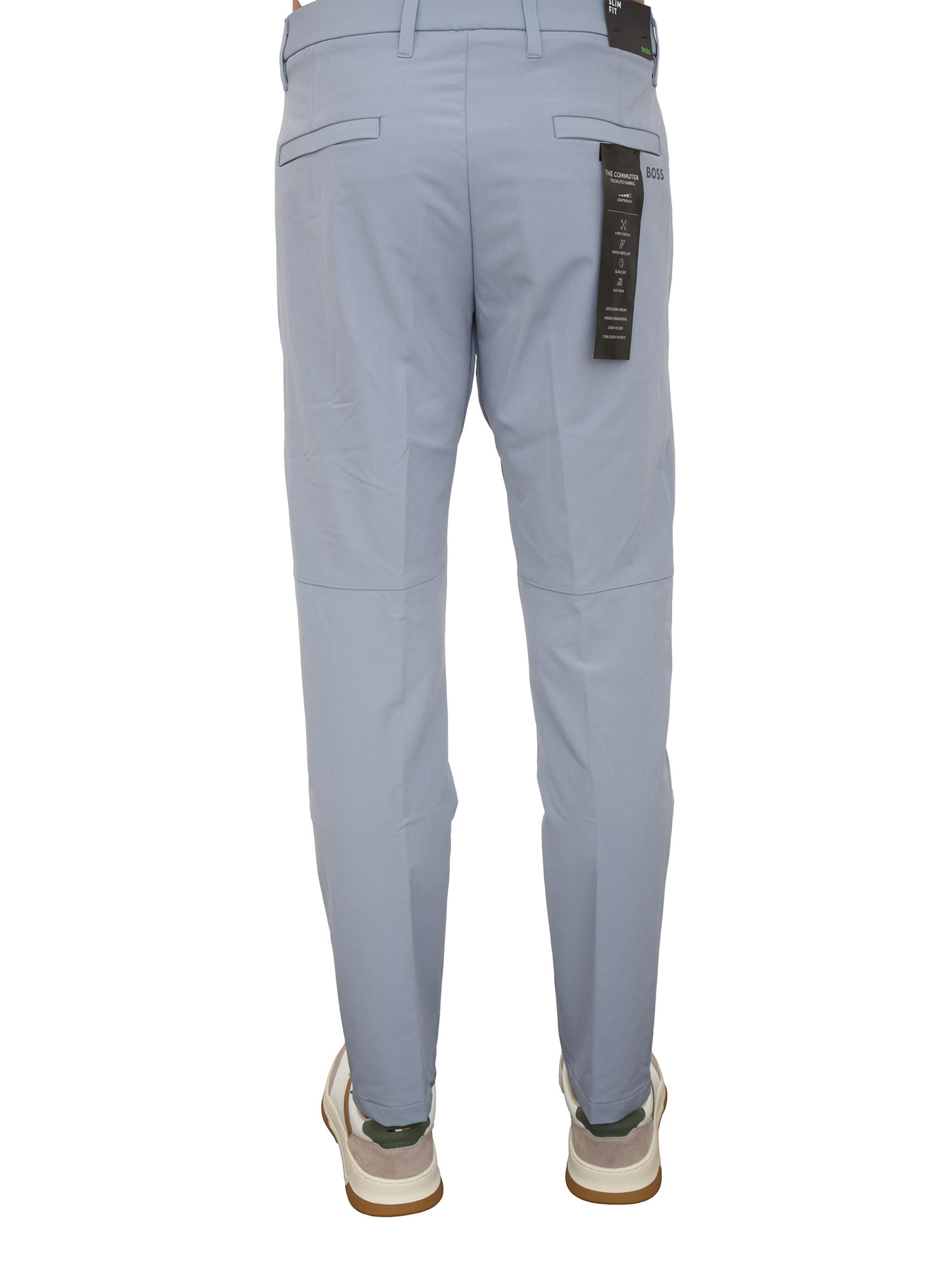 Brand: BOSSAd asciugatura rapida e facili da stirare, questi pantaloni slim fit BOSS uomo sono essenziali per uno stile di vita attivo e metropolitano. Chiusura con zip e bottone e cordoncino nascosto internamente. Tasche laterali e tasche a filetto dietro. Il modello è alto 1.90m e indossa la taglia 48.