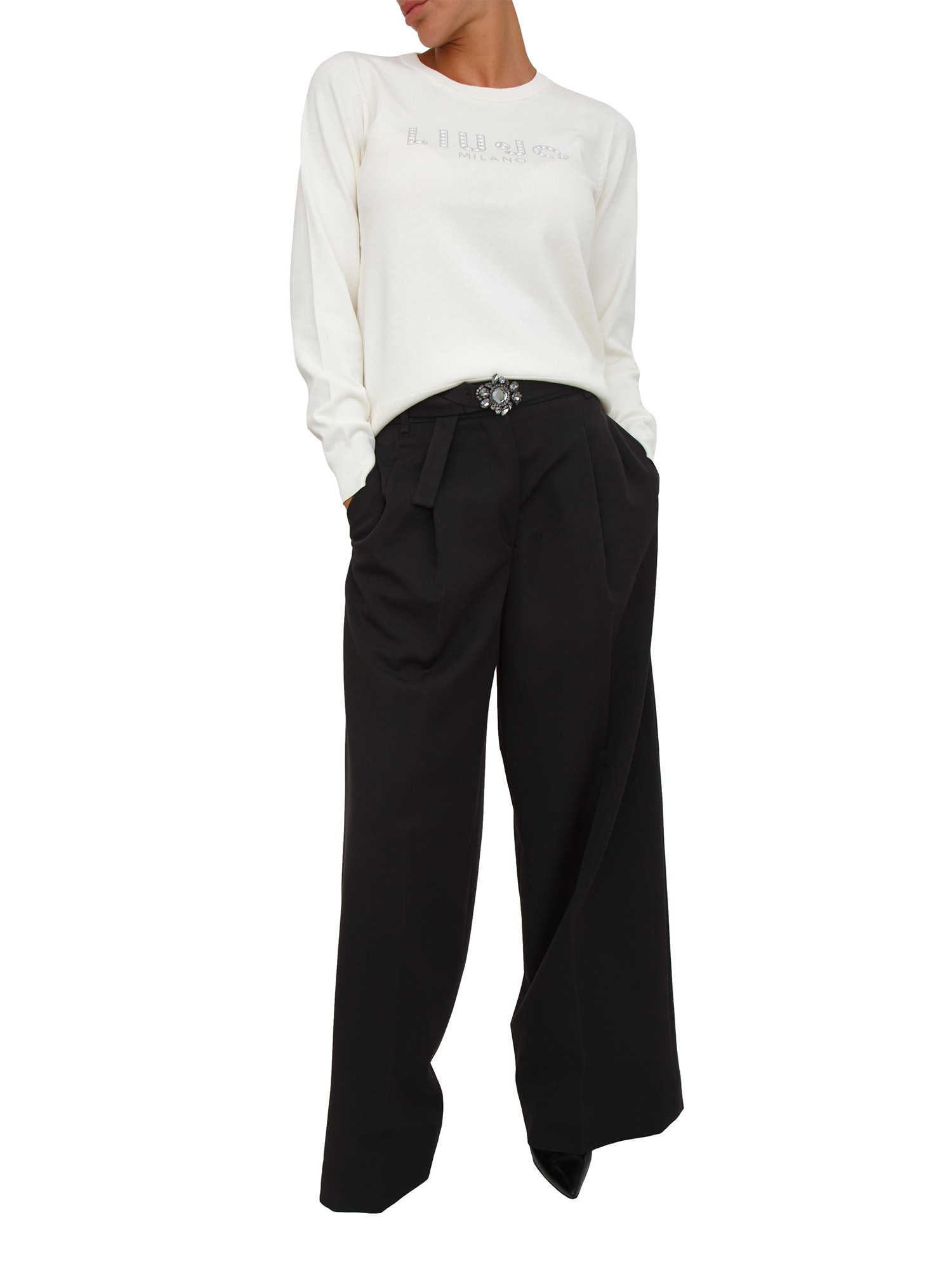 Brand: LIU JOPantaloni Liu Jo donna realizzati in misto viscosa stretch e cintura con gioiello in vita. Modello a palazzo con pinces, piega stirata avanti e dietro e comode tasche laterali. La modella è alta 1.72 e indossa la taglia 38.