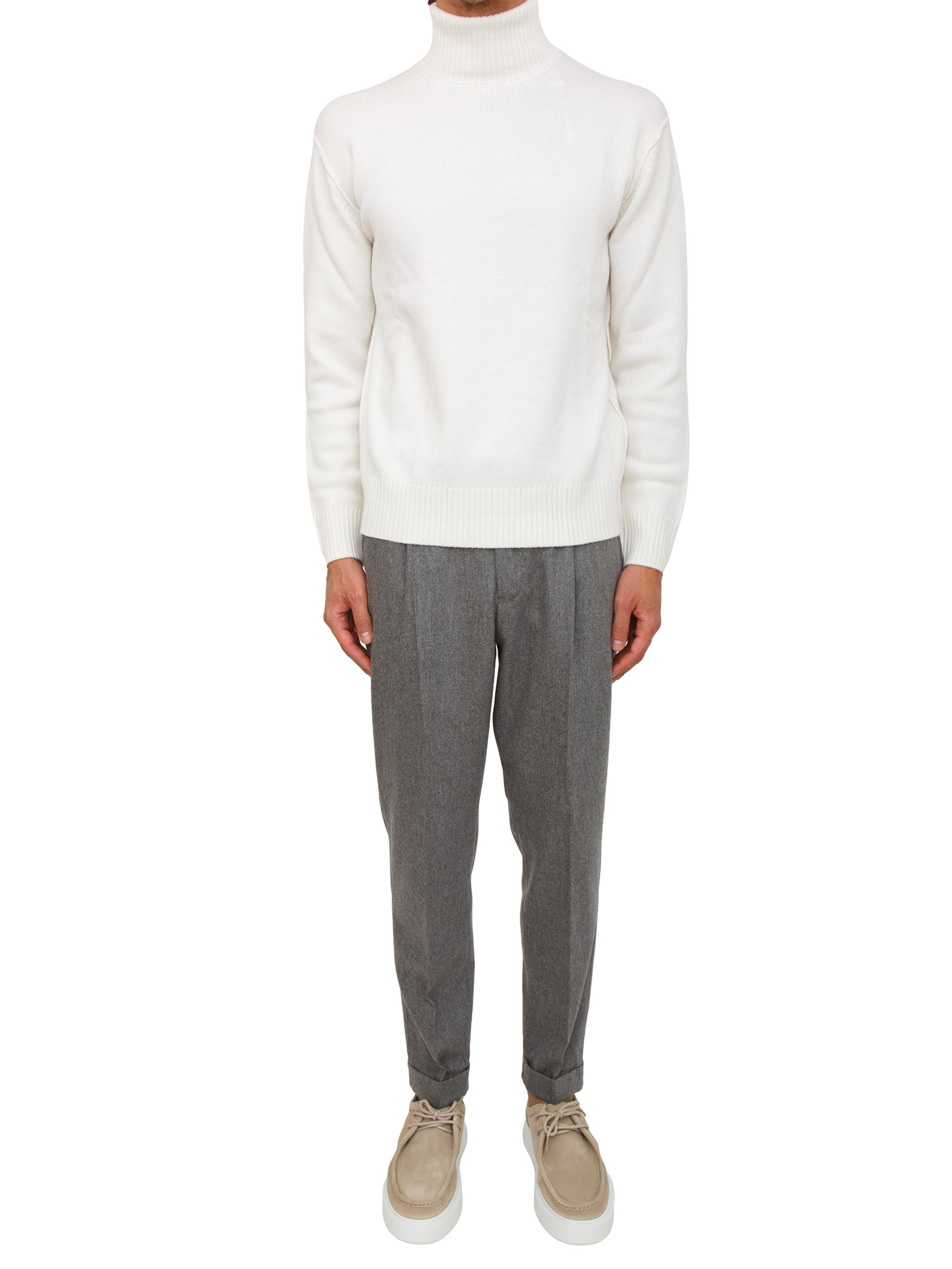 Brand: PT TORINOPantaloni uomo PT Torino modello Edge realizzati in flanella di lana e cachemire, un tessuto morbido e pregiato. Design sartoriale rilassato, con pieghe davanti e tasche con patta sul retro, che dona i look on e off duty un tocco ricercato. Il modello è alto 1.90m e indossa la taglia 48.