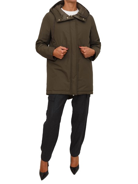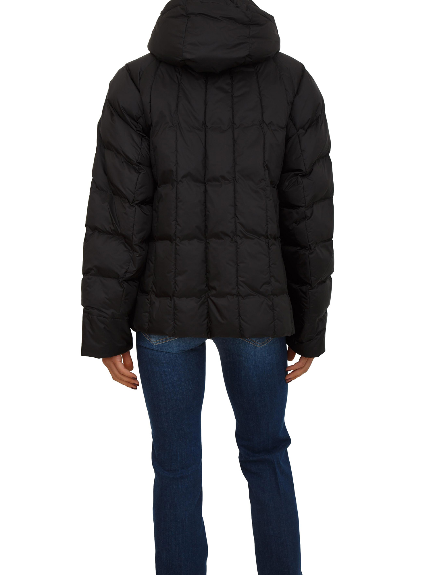Piumino corto Romolo Max Mara MM modello leggermente over con imbottitura in piuma d'oca con motivo trapuntato all over a quadretti rettangolari. Tessuto in tela antigoccia, cappuccio staccabile con coulisse e tasche laterali. La modella è alta 1.72 e indossa la taglia 40.