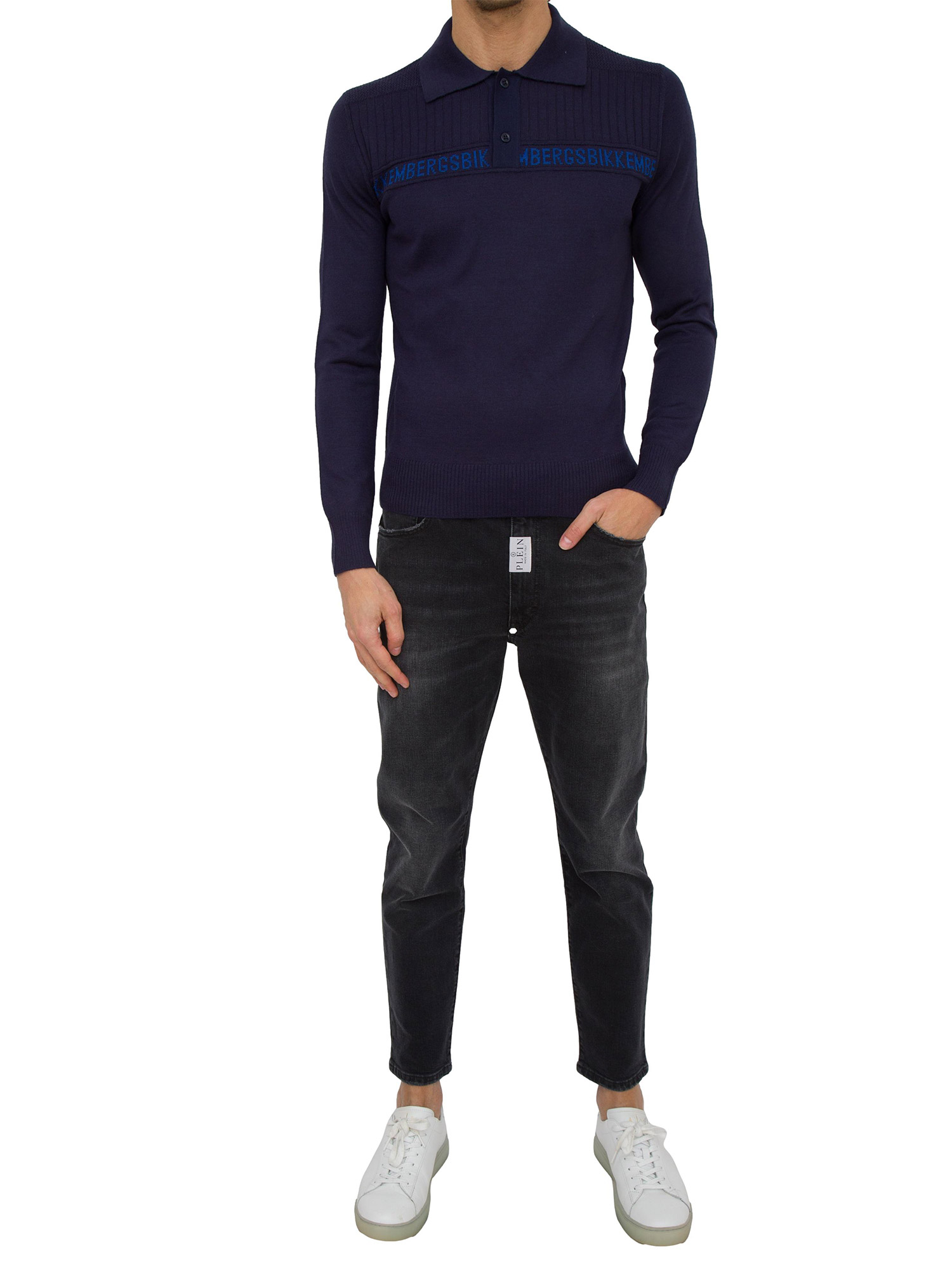 Brand: BIKKEMBERGSDettaglio a coste per la polo da uomo Bikkembergs realizzata in maglia di misto lana. Il maglione, con chiusura a due bottoni, è arricchito dal logo jacquard in filo a contrasto posizionato sul petto.