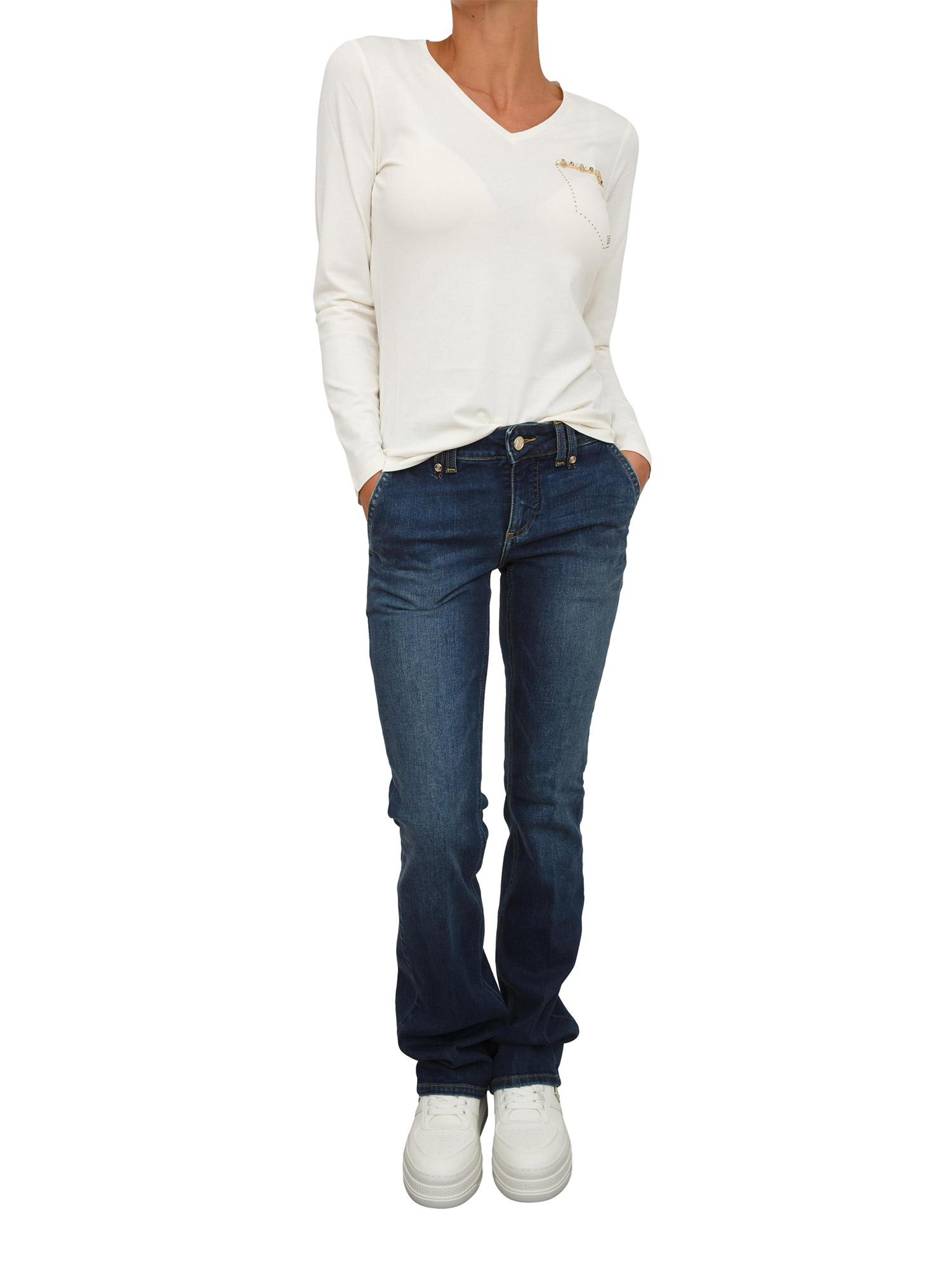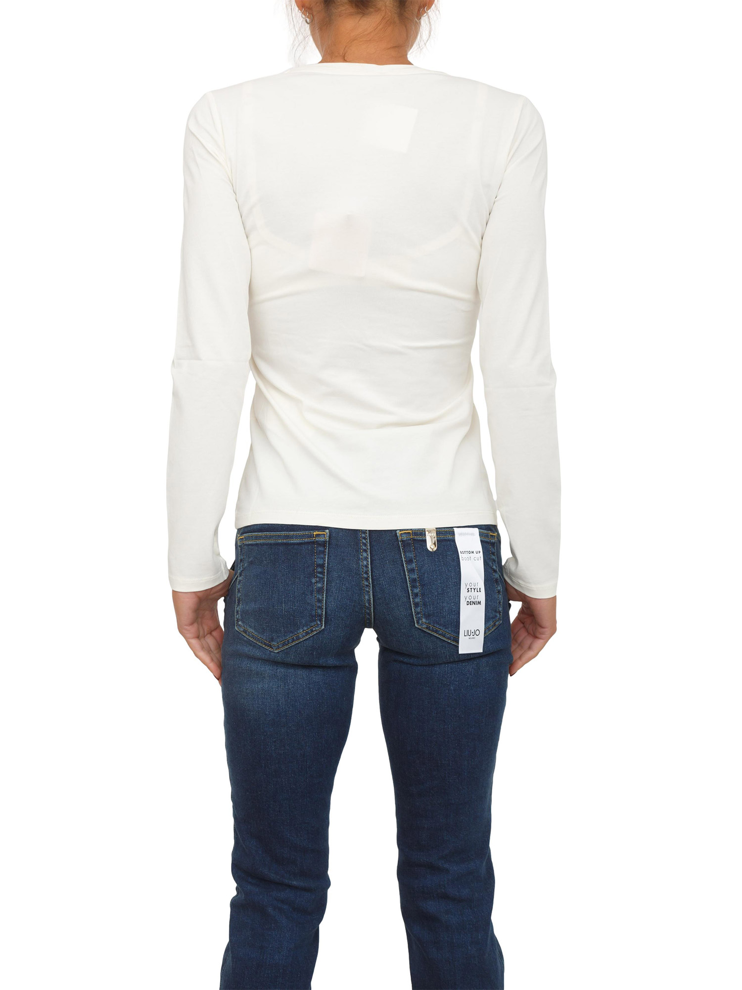 Brand: LIU JOT-shirt Liu Jo donna realizzata in jersey di cotone stretch con maniche lunghe e scollo a V. Modello caratterizzato da taschino disegnato con strass applicati e logo sul petto. La modella è alta 1.72 e indossa la taglia XS.