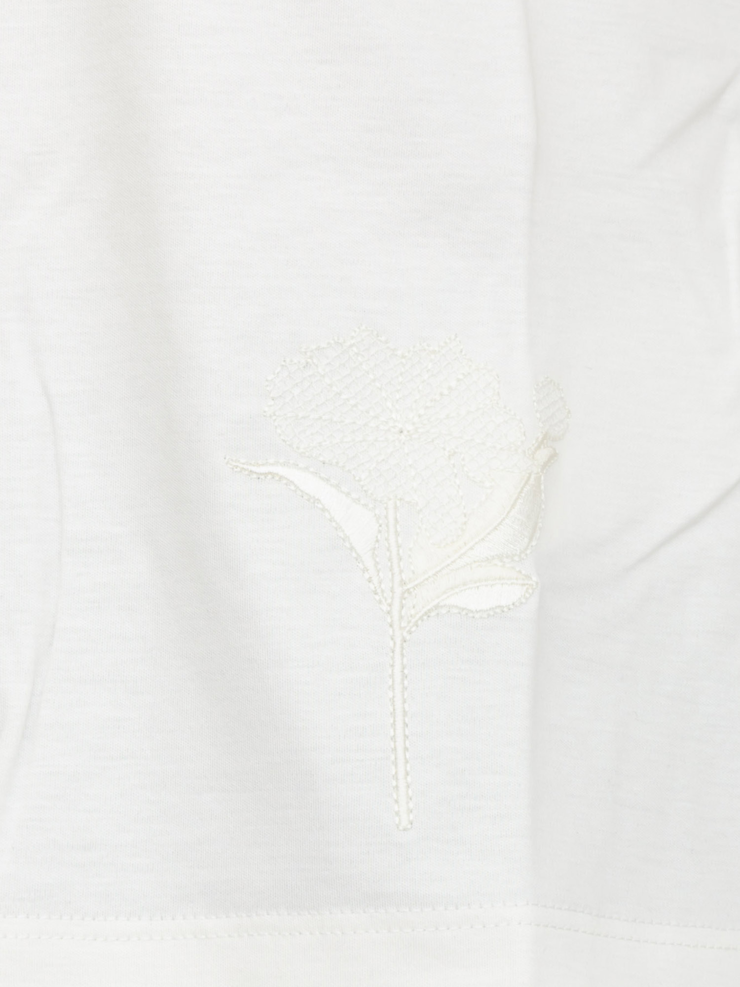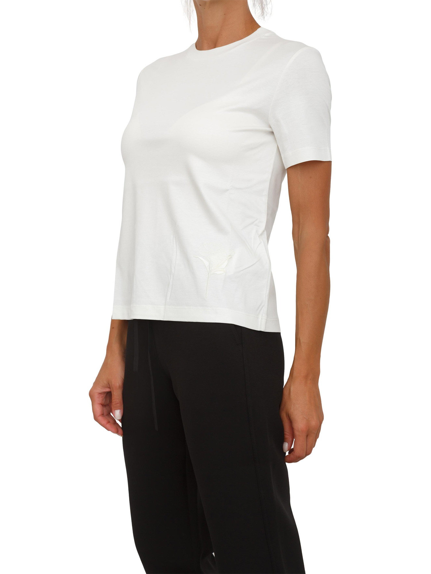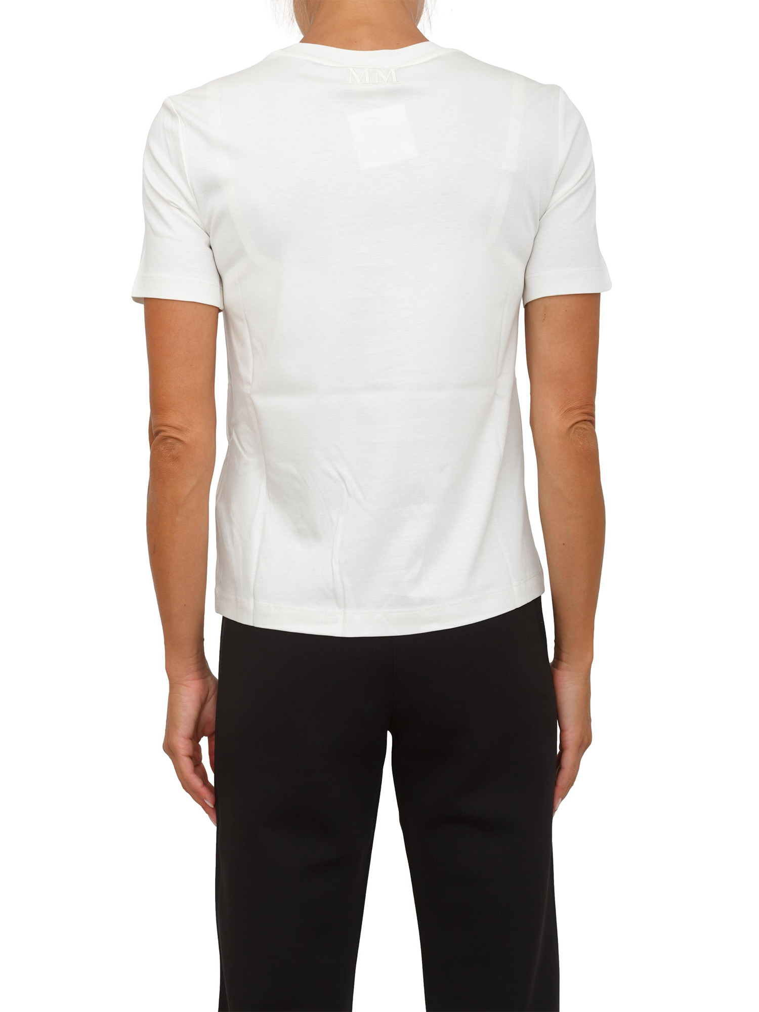 Brand: MAX MARA MMT-shirt Max Mara MM realizzata in jersey di cotone con linea dritta, girocollo e fondo dritto. Design personalizzato con fiore ricamato tono su tono in fondo a sinistra e logo dietro il collo. Ideale da indossare in ogni outfit. La modella è alta 1.72 e indossa la taglia XS.