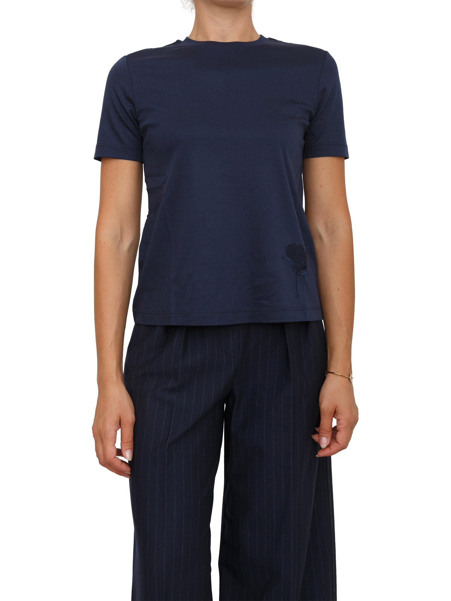 T-shirt Max Mara MM in jersey di cotone blu con ricamo fiore