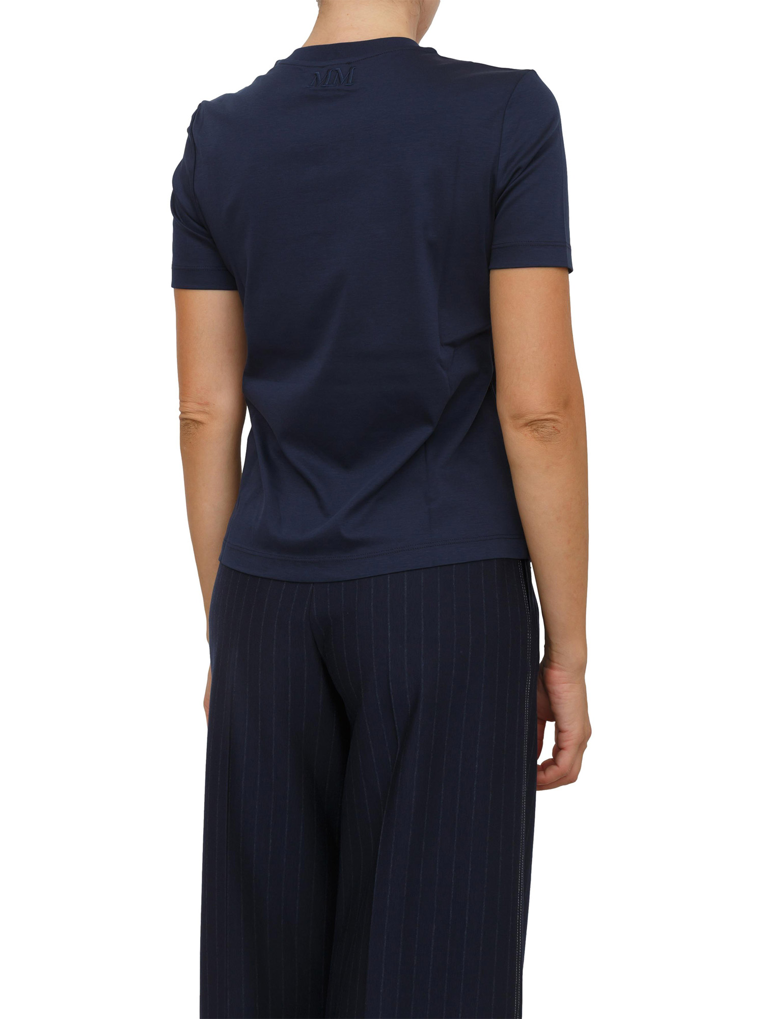 Brand: MAX MARA MMT-shirt Max Mara MM realizzata in jersey di cotone con linea dritta, girocollo e fondo dritto. Design personalizzato con fiore ricamato tono su tono in fondo a sinistra e logo dietro il collo. Ideale da indossare in ogni outfit. La modella è alta 1.72 e indossa la taglia XS.