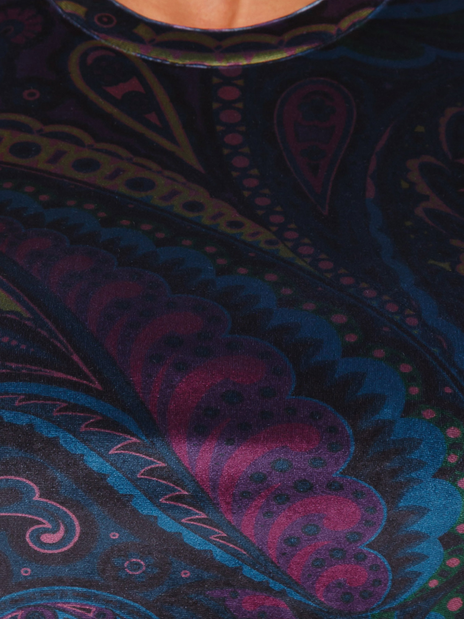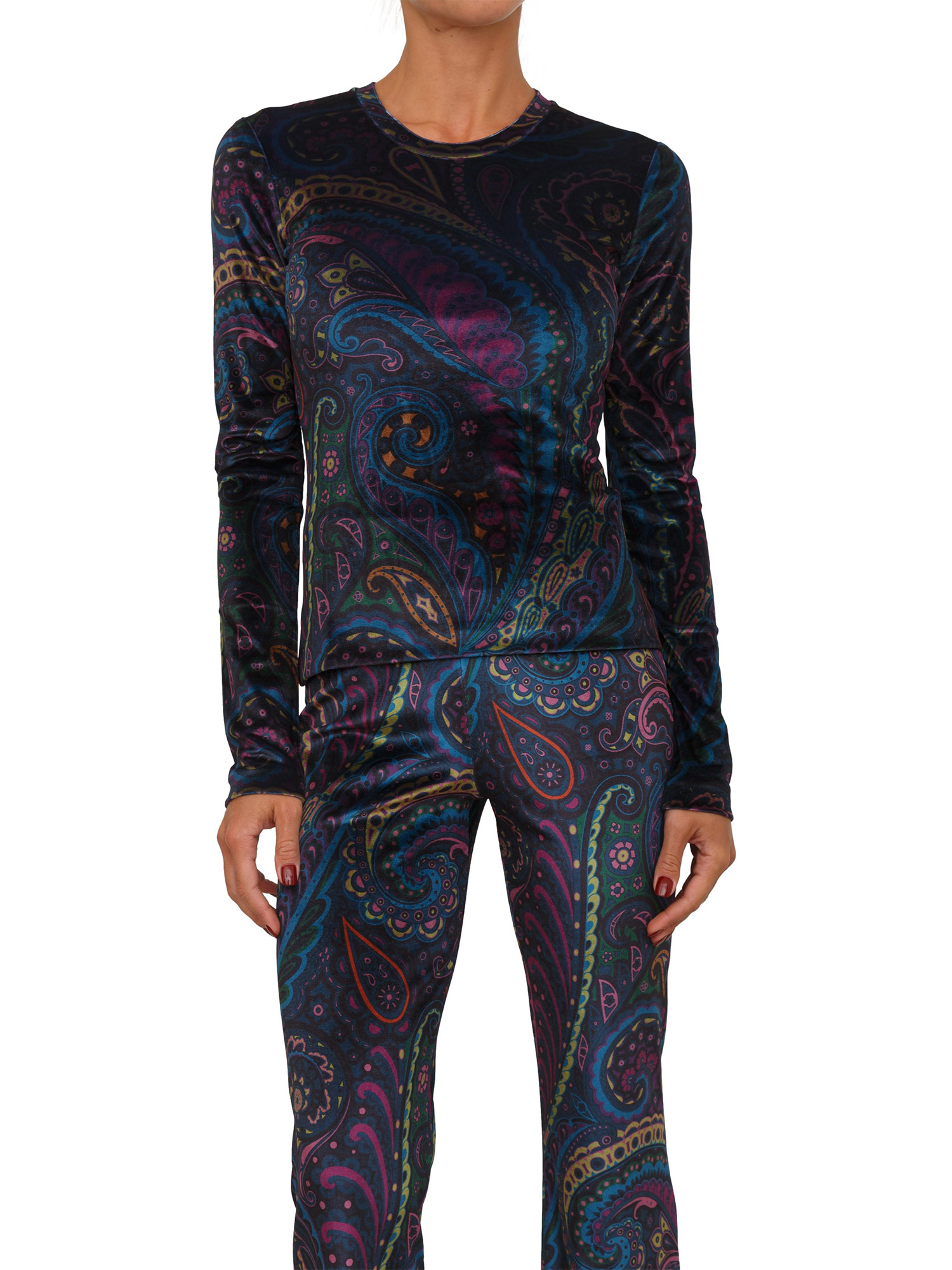 Brand: ETROTop Etro donna realizzato in morbida ciniglia stretch con stampa Paisley multicolor all over. Vestibilità slim con girocollo e maniche lunghe. Stupendo da indossare con il suo pantalone. La modella è alta 1.72 e indossa la taglia S.