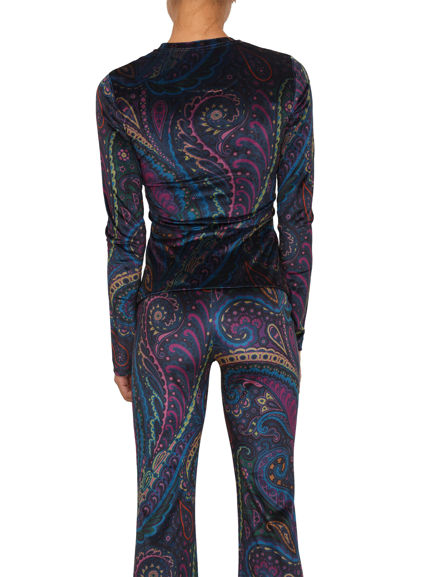 Top Etro donna in ciniglia blu con Paisley multicolor all over