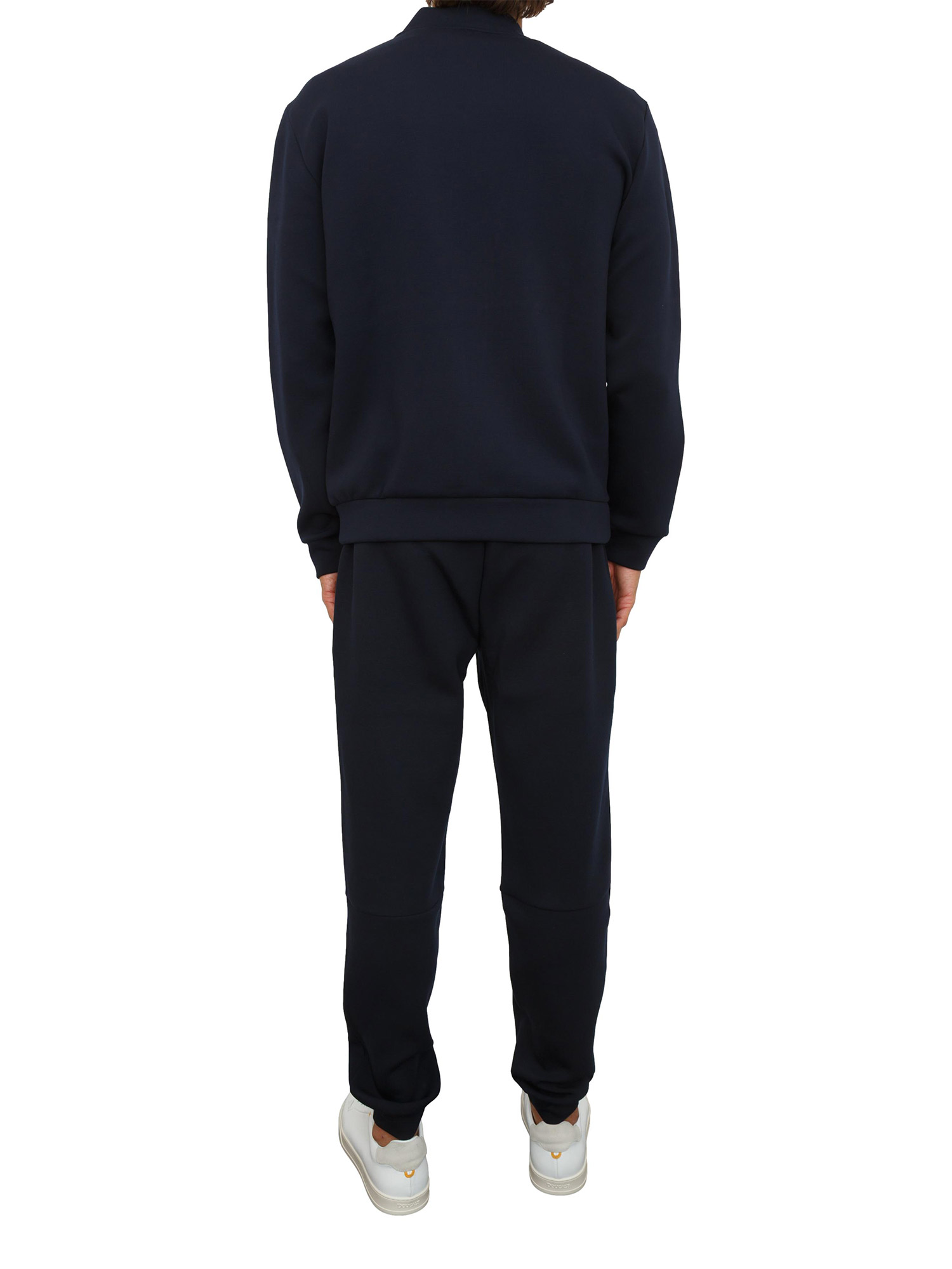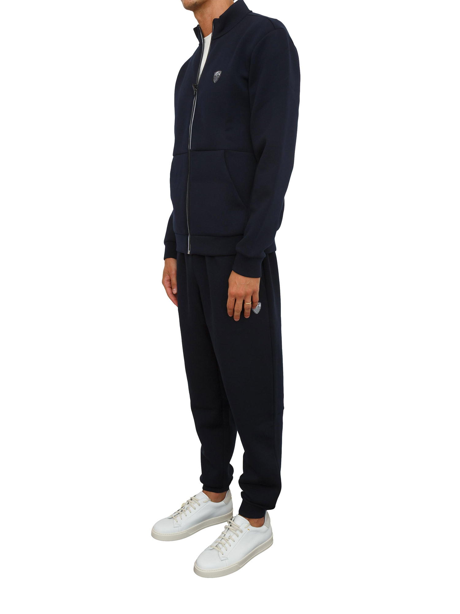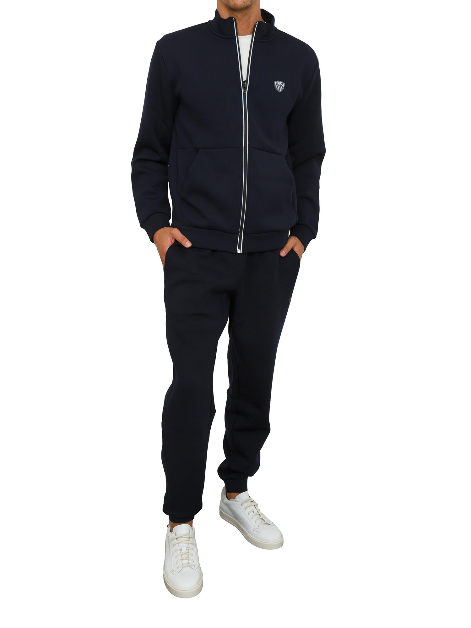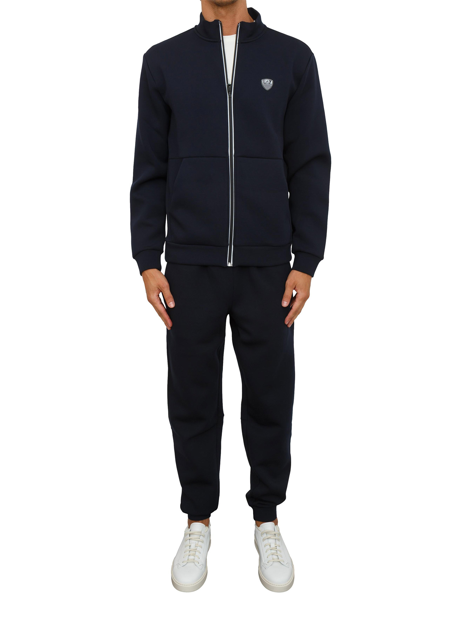 Tuta realizzata in misto viscosa stretch, dalla vestibilità regular e confortevole. Il modello si compone di una felpa con collo montante e chiusura con zip e un pantalone jogger con coulisse, entrambi personalizzati dal patch con logo scudetto EA7.
