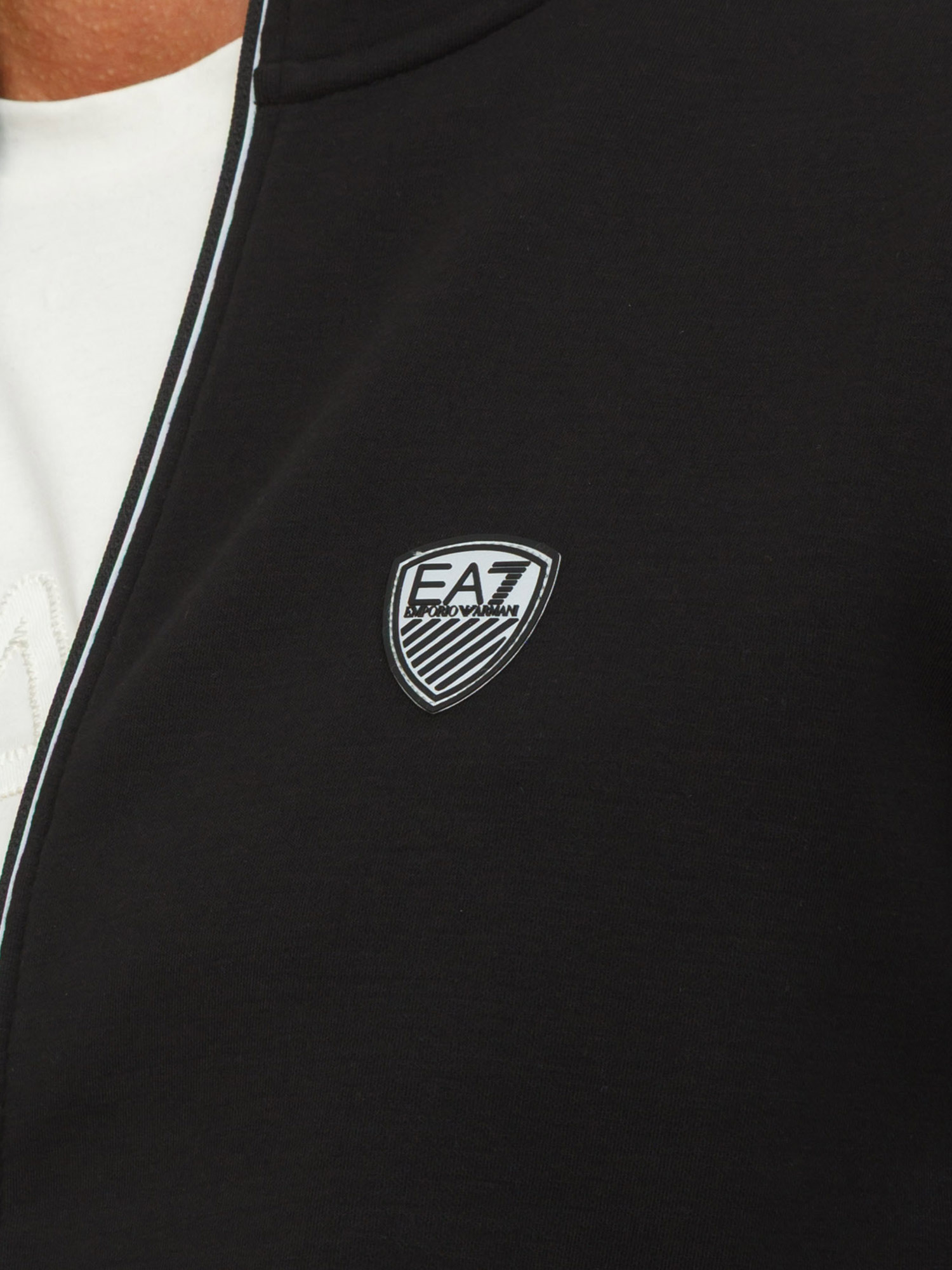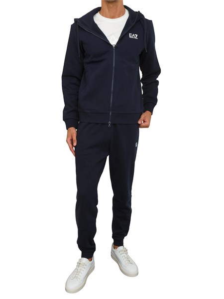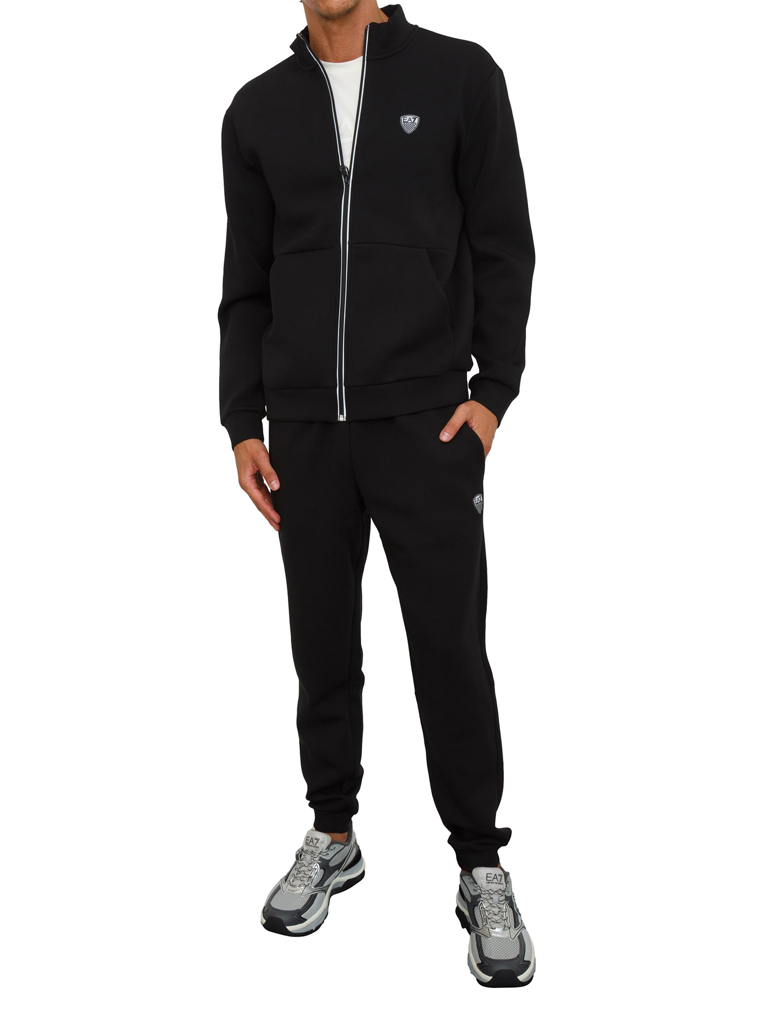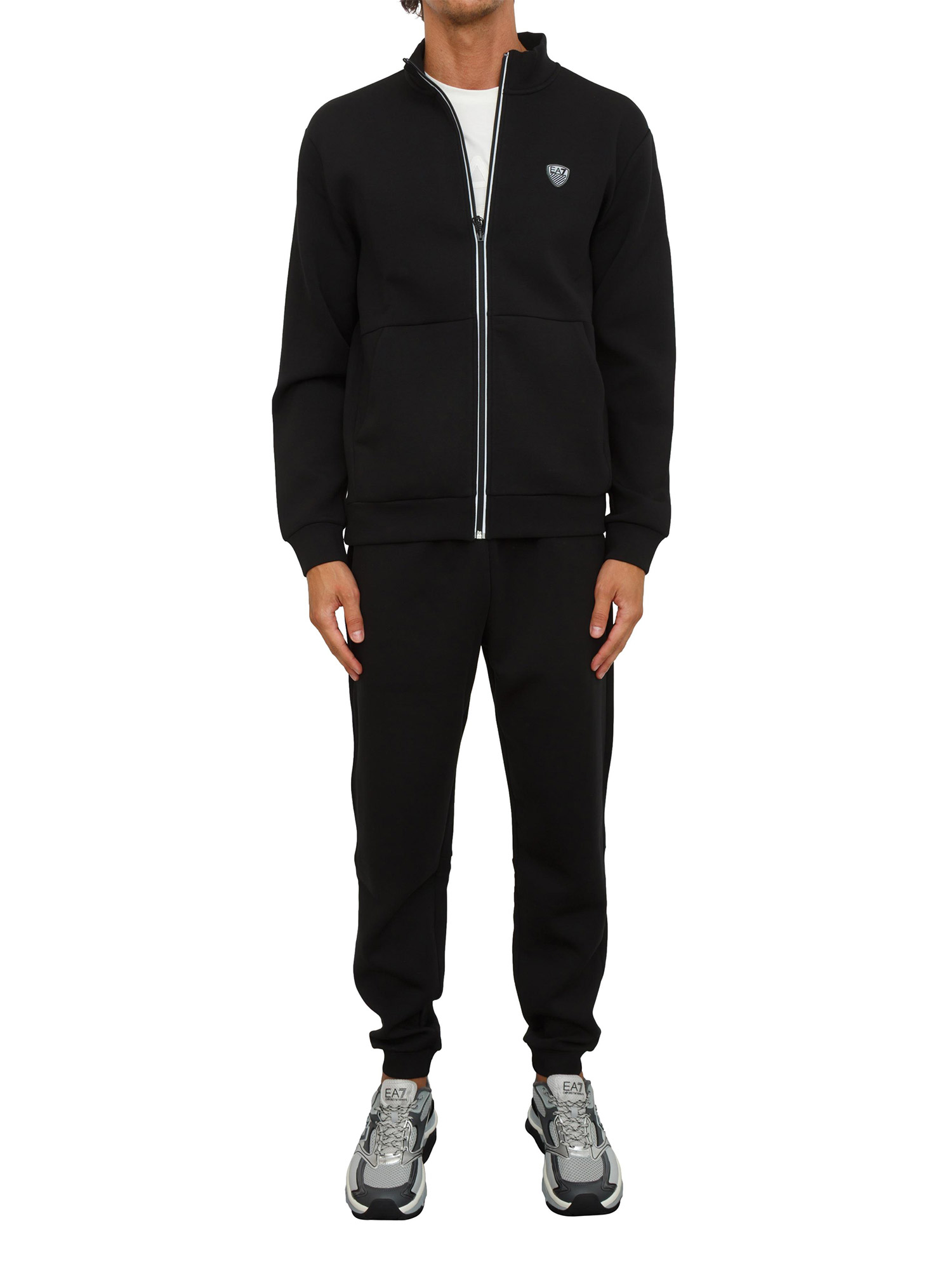 Tuta realizzata in misto viscosa stretch, dalla vestibilità regular e confortevole. Il modello si compone di una felpa con collo montante e chiusura con zip e un pantalone jogger con coulisse, entrambi personalizzati dal patch con logo scudetto EA7.