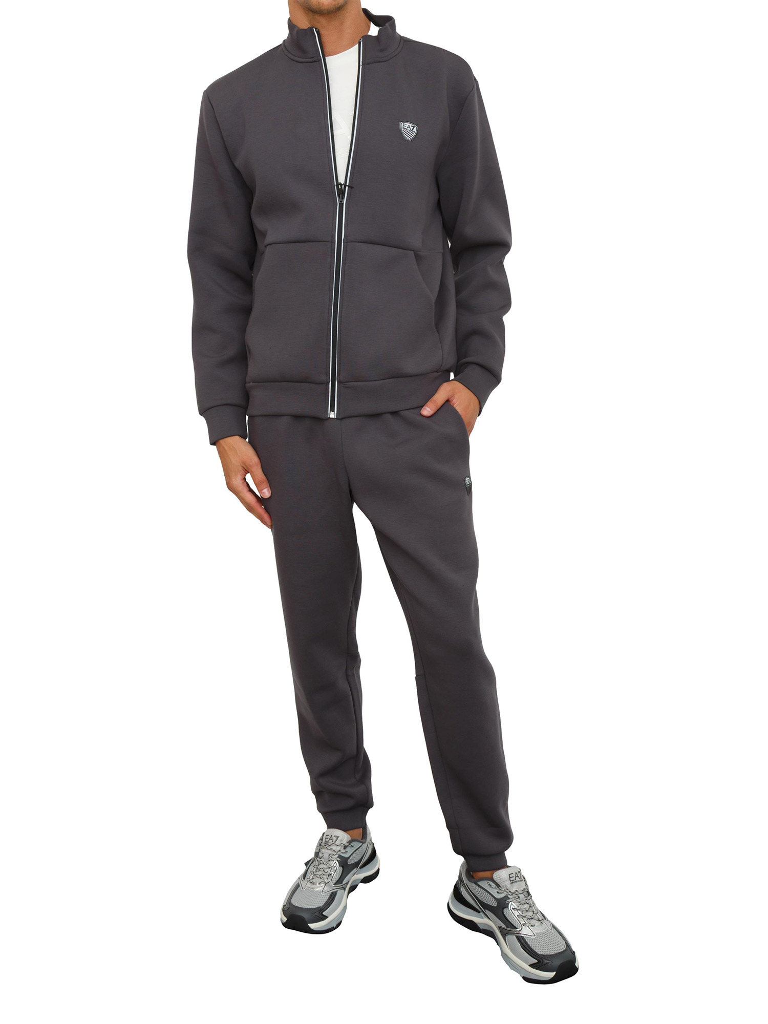 Tuta realizzata in misto viscosa stretch, dalla vestibilità regular e confortevole. Il modello si compone di una felpa con collo montante e chiusura con zip e un pantalone jogger con coulisse, entrambi personalizzati dal patch con logo scudetto EA7.