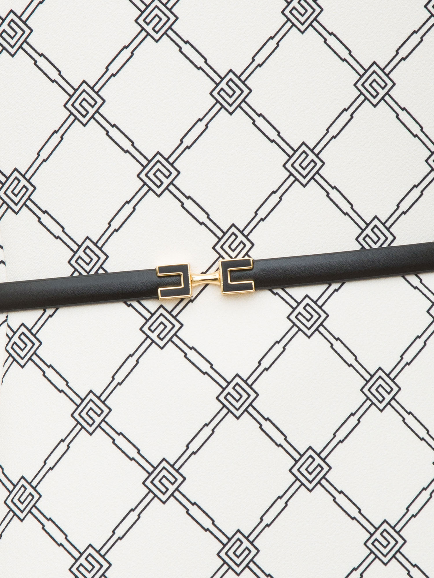 Brand: ELISABETTA FRANCHIAbito smanicato in crêpe stretch con gonna leggermente bombata. Il vestito si distingue per la stampa all-over a losanghe e il piping a contrasto. Punto vita definito dalla cintura con morsetto gioiello in metallo dorato con logo. Vestibilità aderente.La modella è alta 1.65m e indossa la taglia 42.